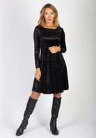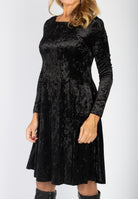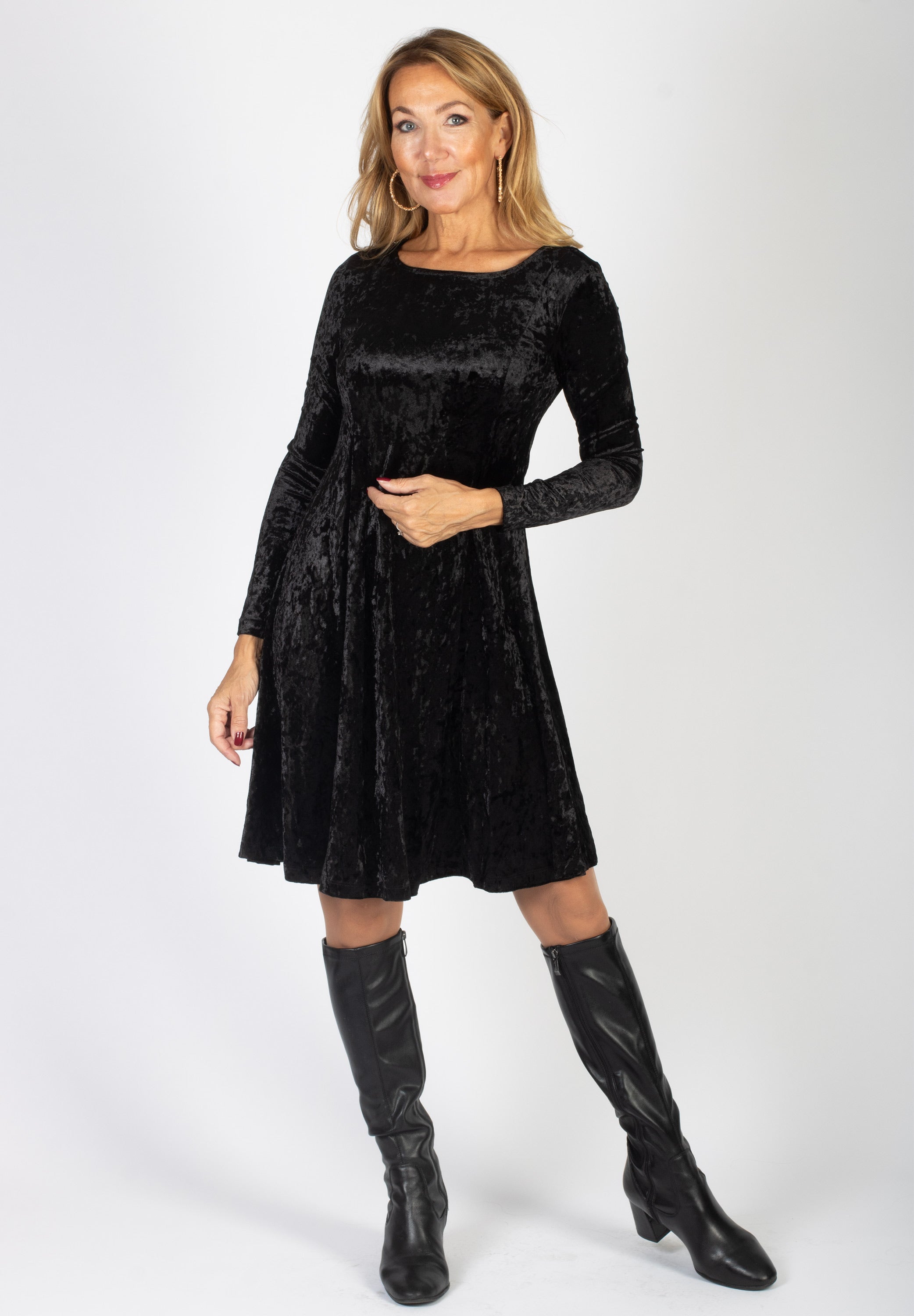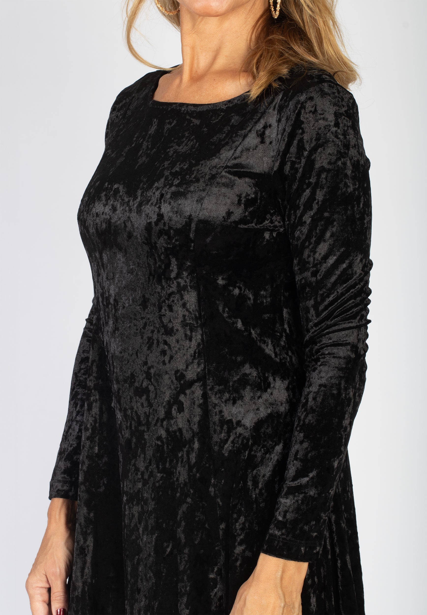 Kort A-linjeformad klänningstunika i sammet. Klänningen har lång ärm och dragkedja i ryggen. Klänningen kan bäras på egen hand eller kombineras med byxor, leggings eller strumpbyxor för en elegant, men avslappnad look.
