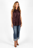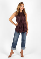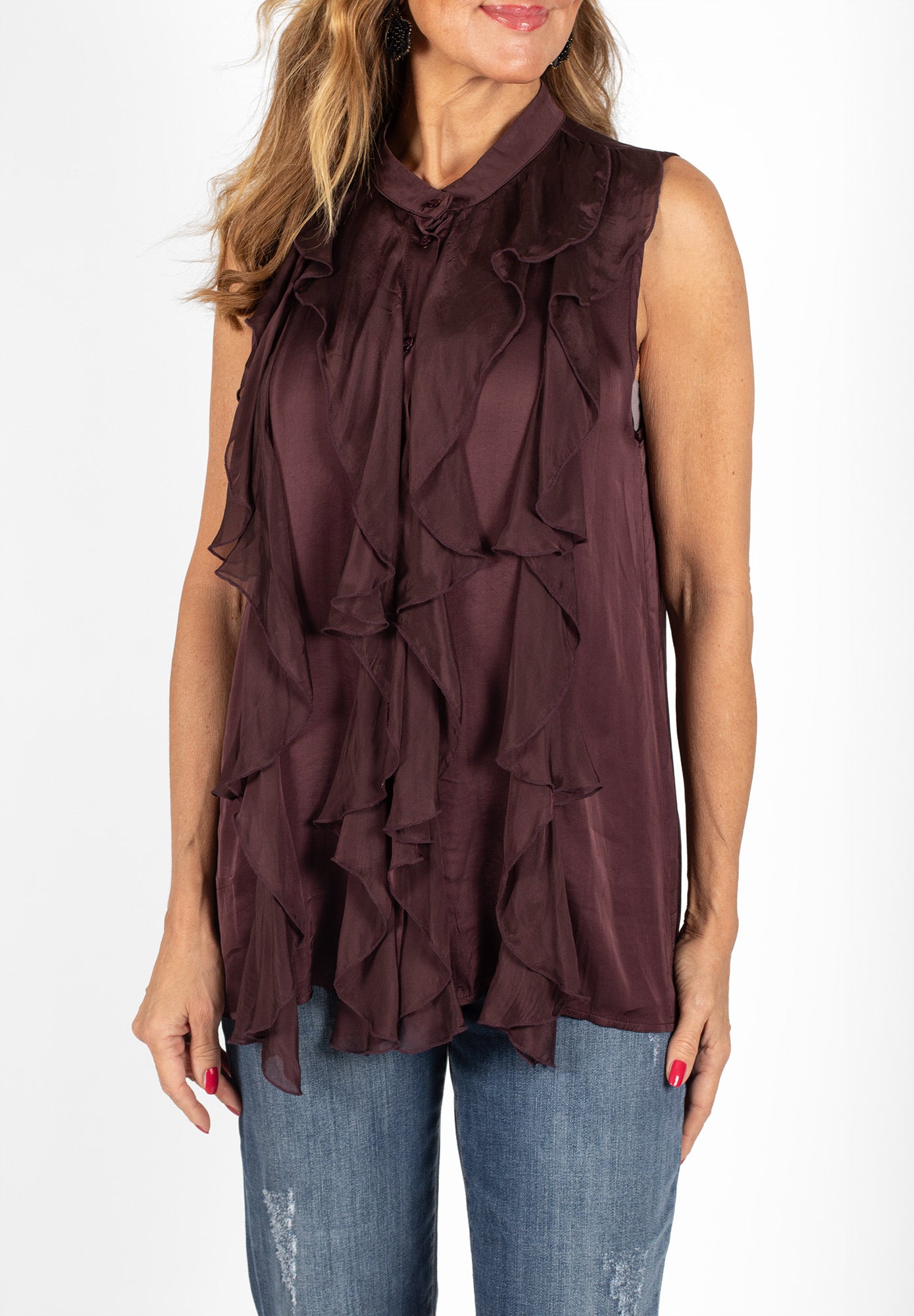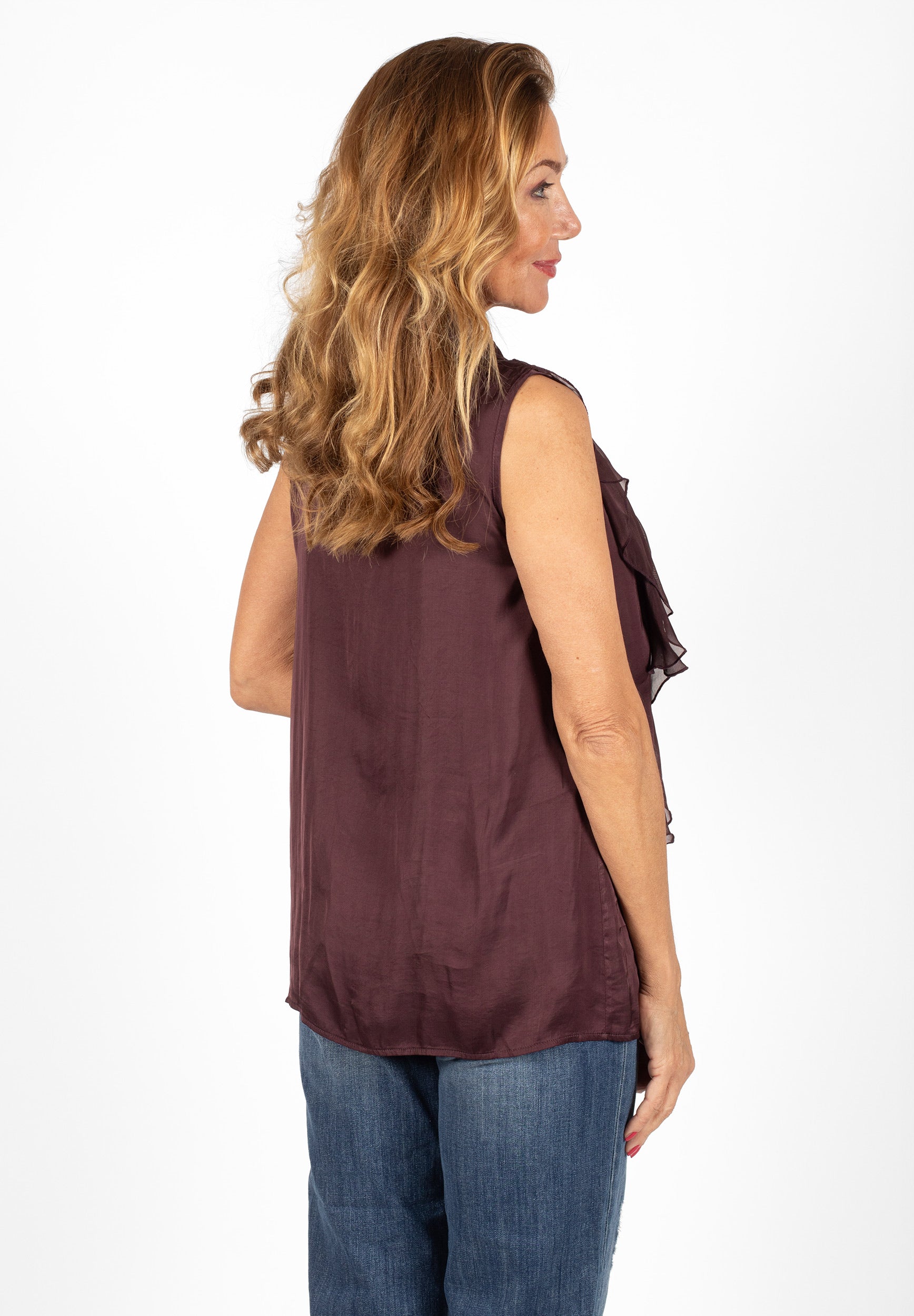 Ärmlös topp med dekorativ volang framtill. Modellen har knappar hela vägen fram och en liten ståkrage. Tillverkad i ett tyg med fin satinfinish.