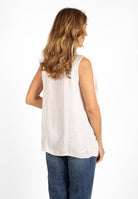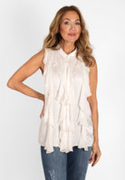 Ärmlös topp med dekorativ volang framtill. Modellen har knappar hela vägen fram och en liten ståkrage. Tillverkad i ett tyg med fin satinfinish.