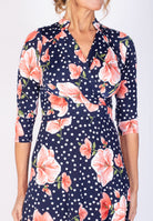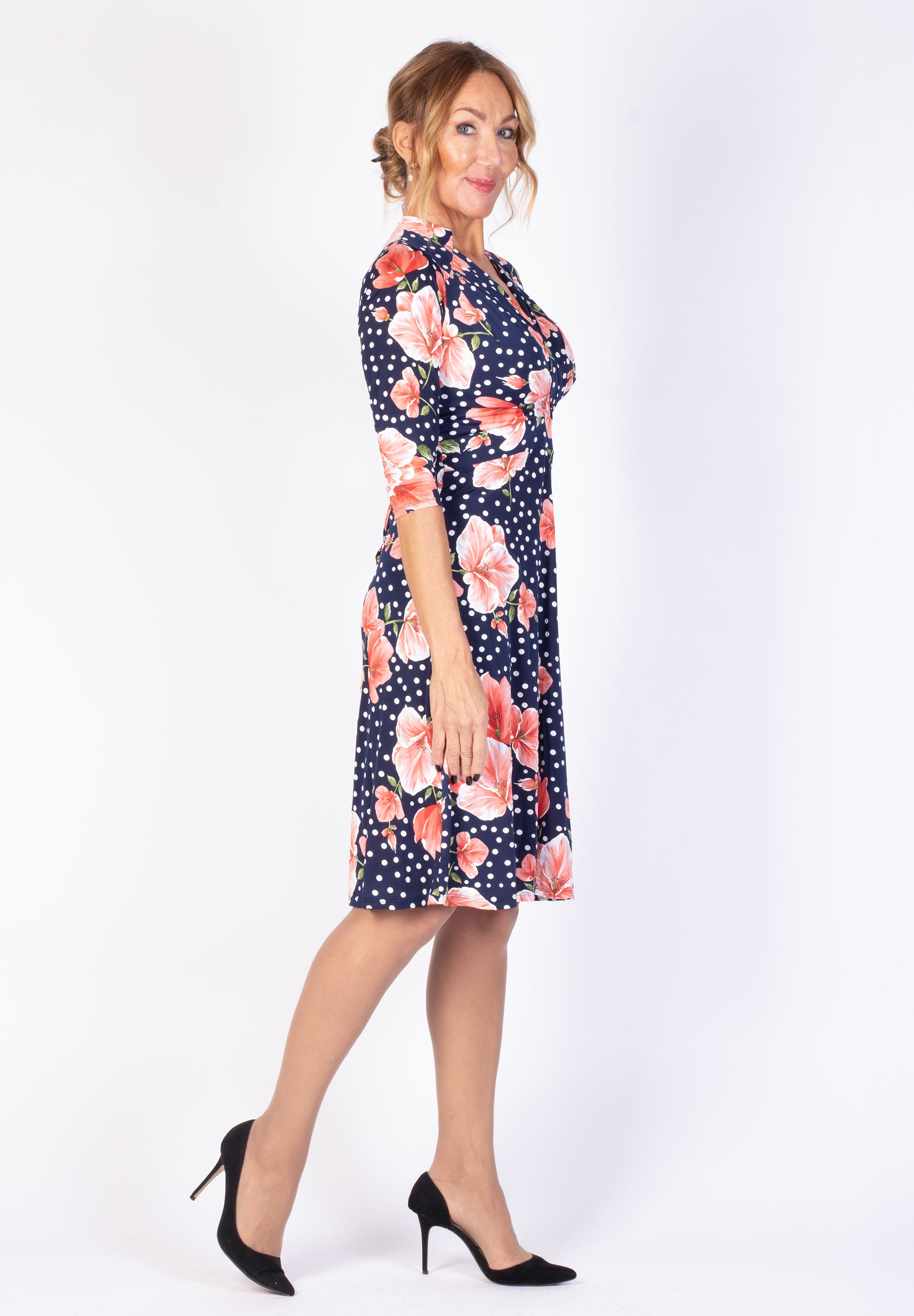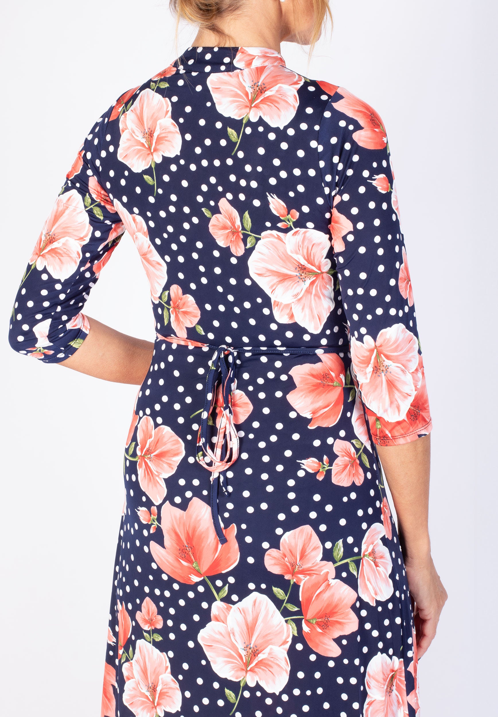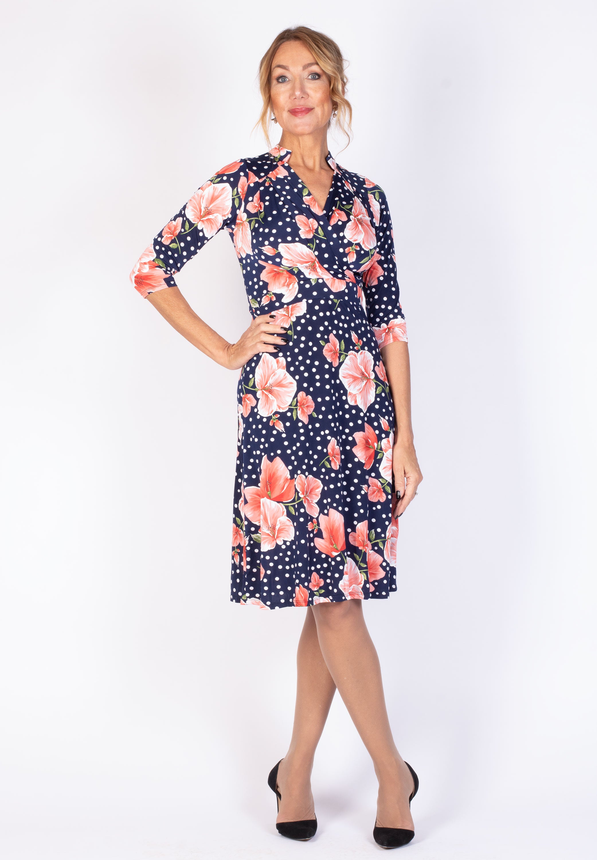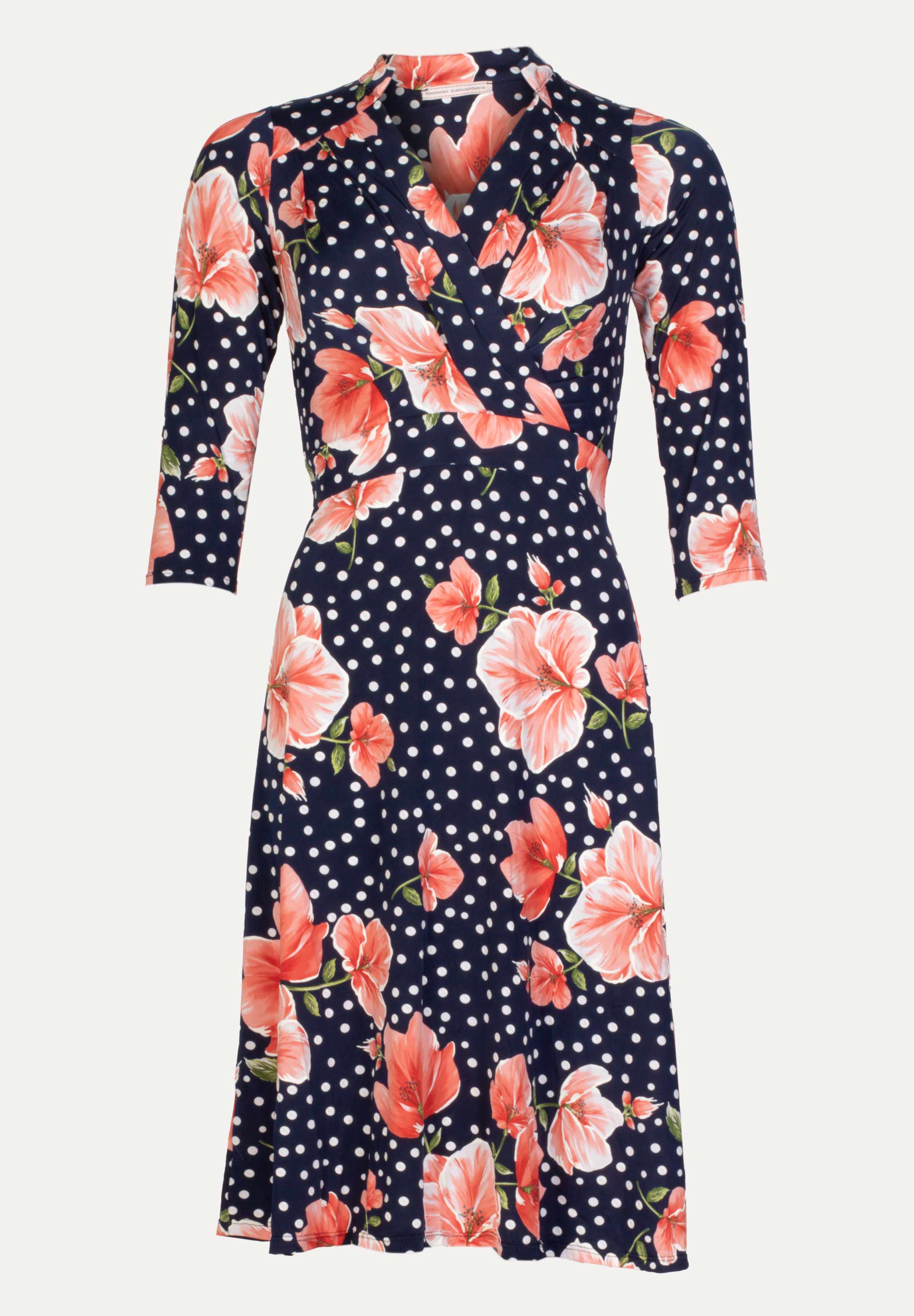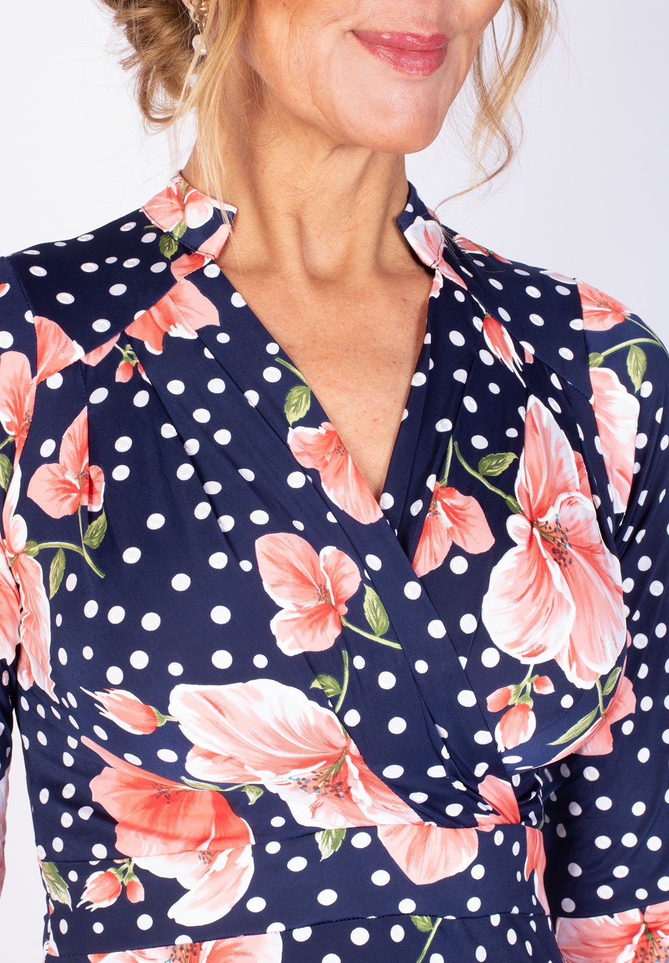 Klänningen har en figurnära överdel som ger en smickrande siluett och lång ärm. V-ringning med en stående krage. Avskuren i midjan med ett smalt band som knyts bak i ryggen.