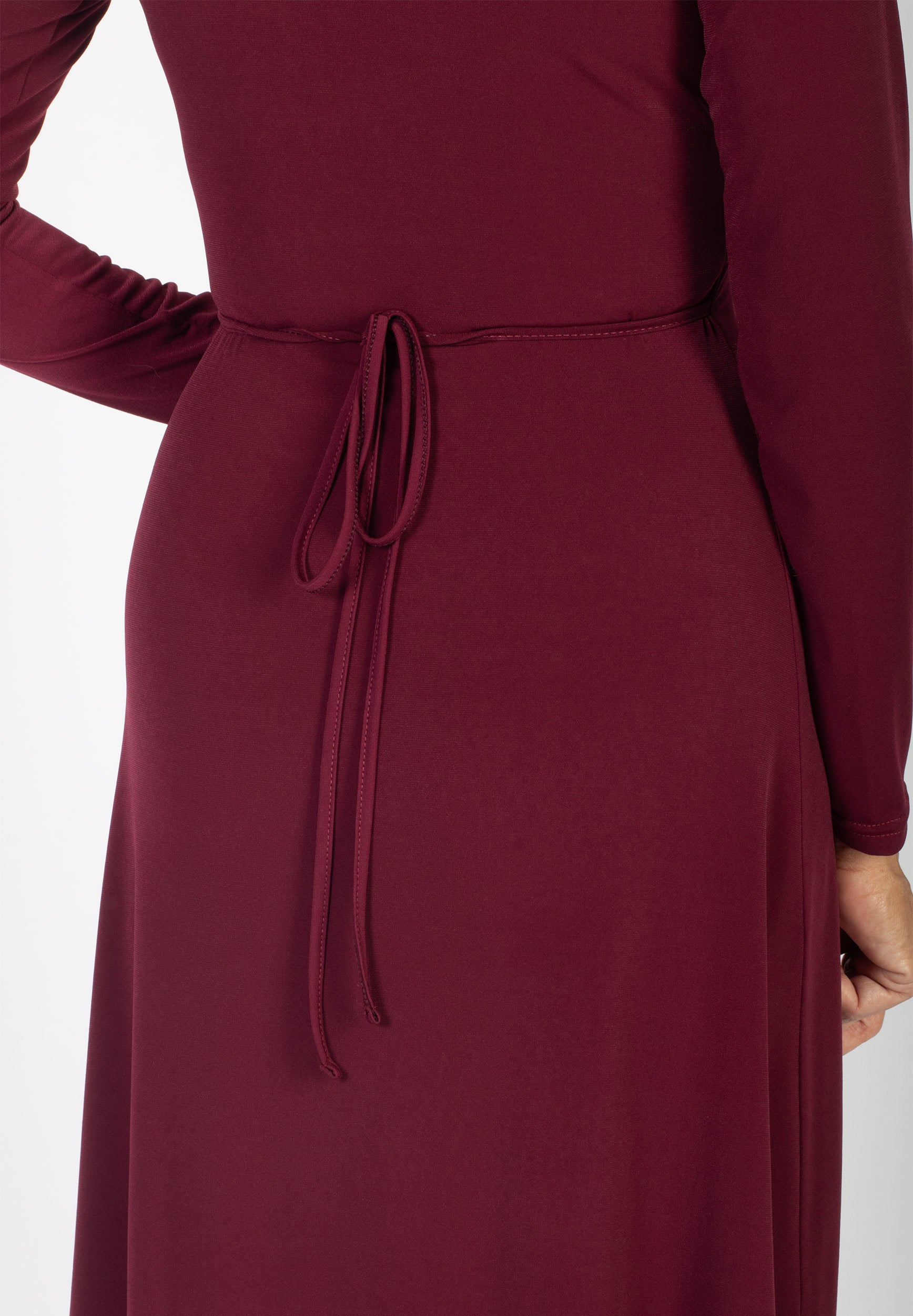 Klänningen har en figurnära överdel som ger en smickrande siluett och lång ärm. V-ringning med en stående krage. Avskuren i midjan med ett smalt band som knyts bak i ryggen.