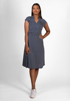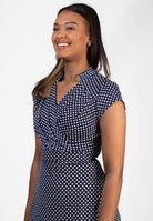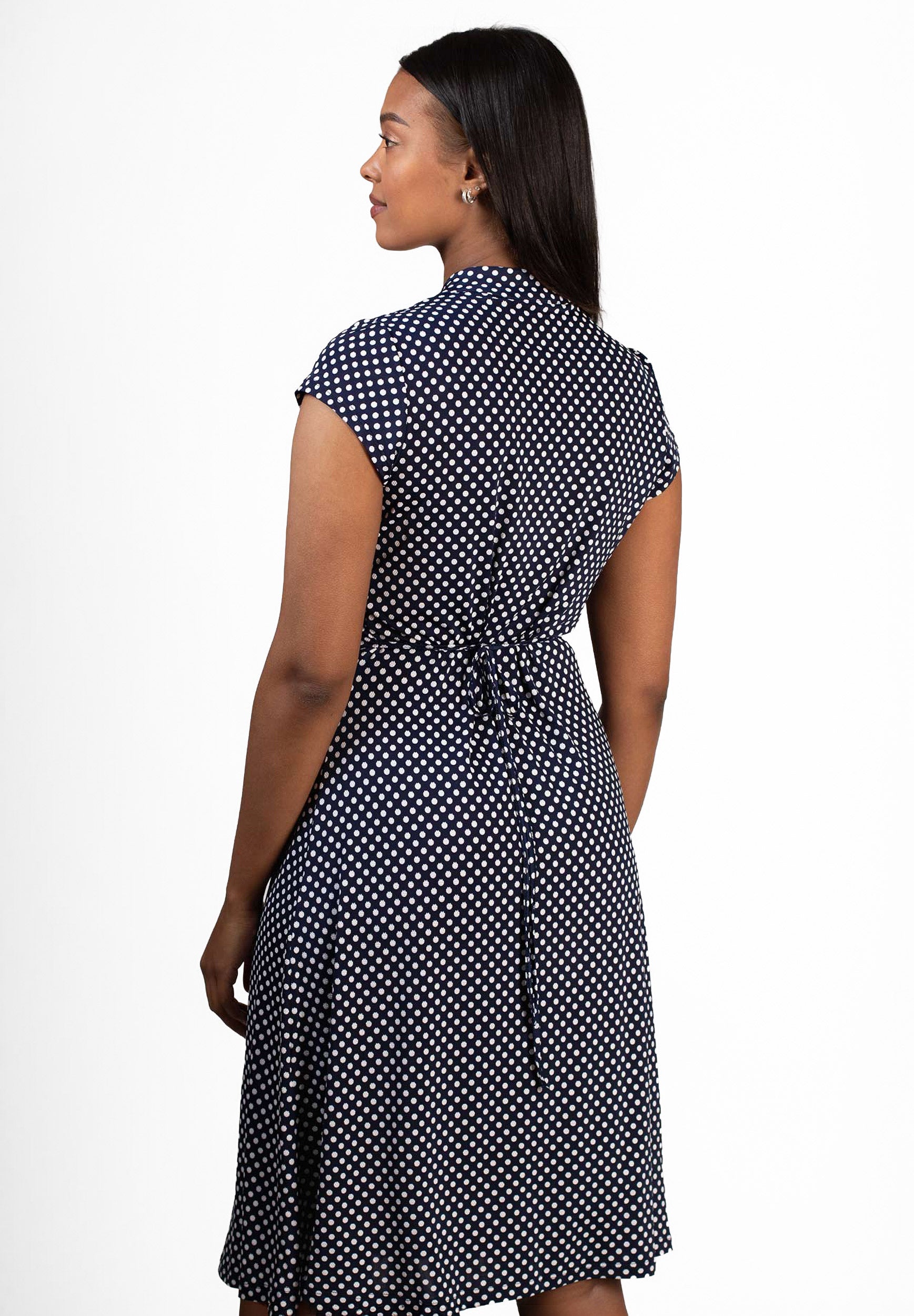 Klänningen har en figurnära överdel som ger en smickrande siluett och kort ärm. V-ringning med en stående krage. Avskuren i midjan med ett smalt band som knyts bak i ryggen.