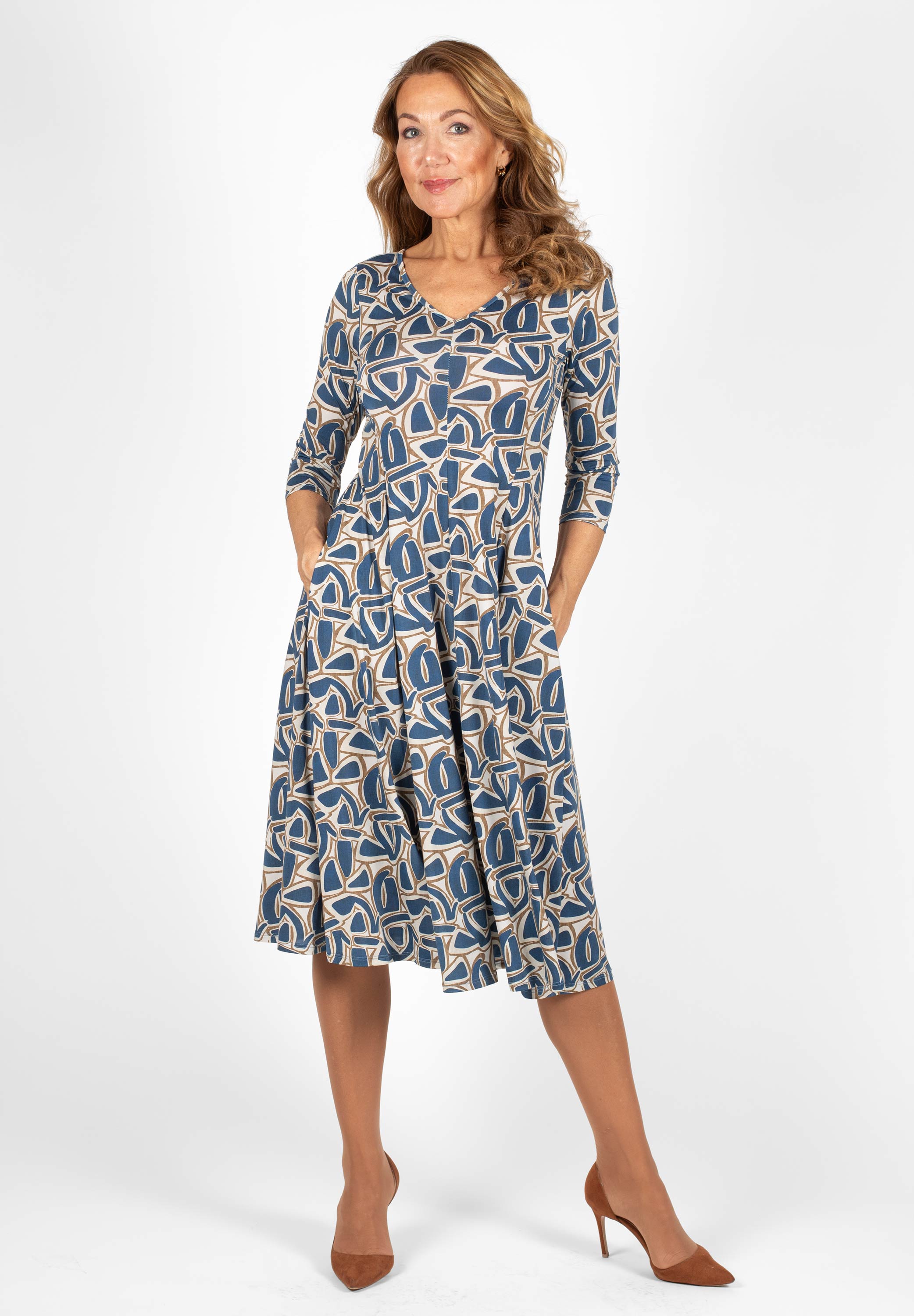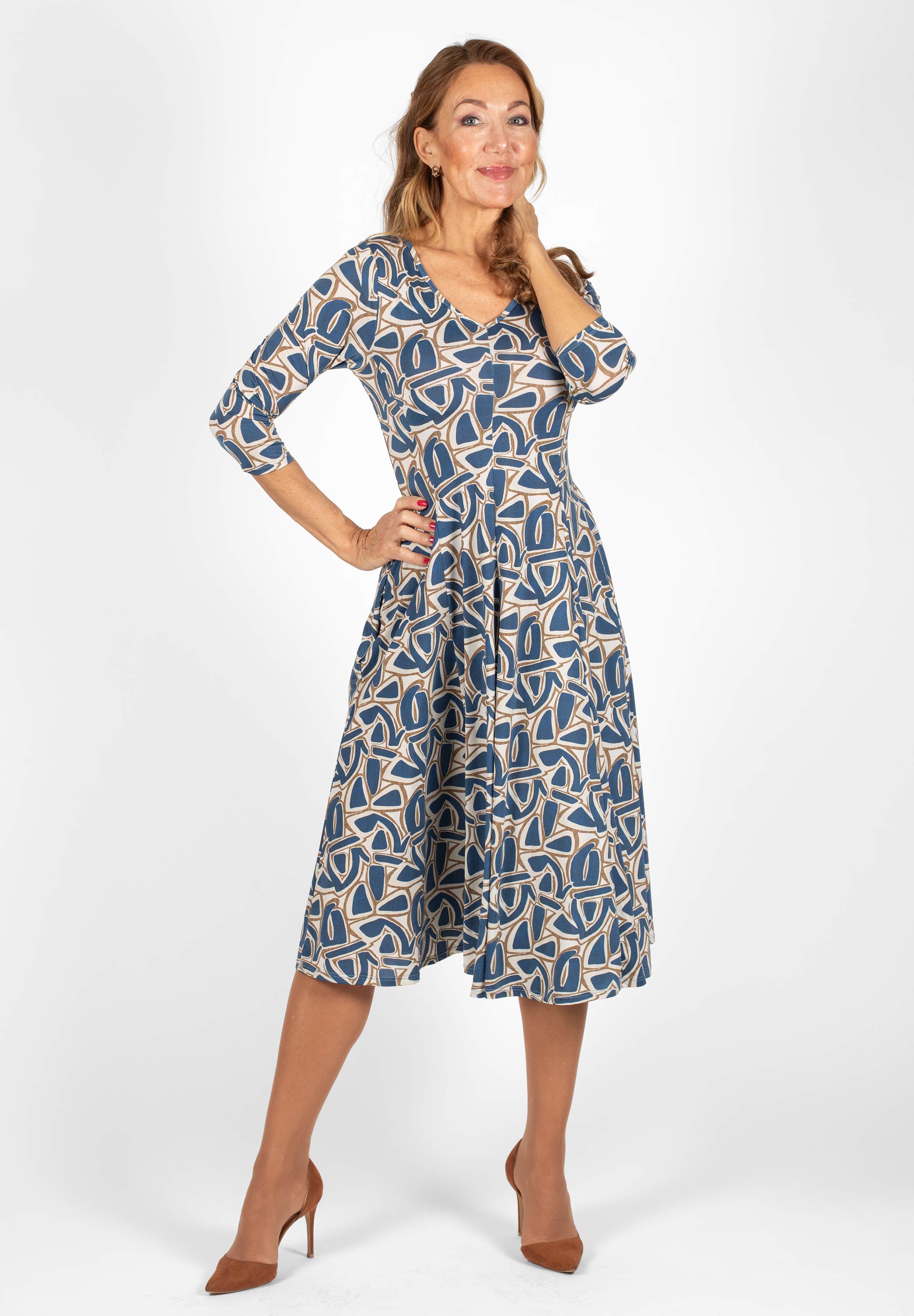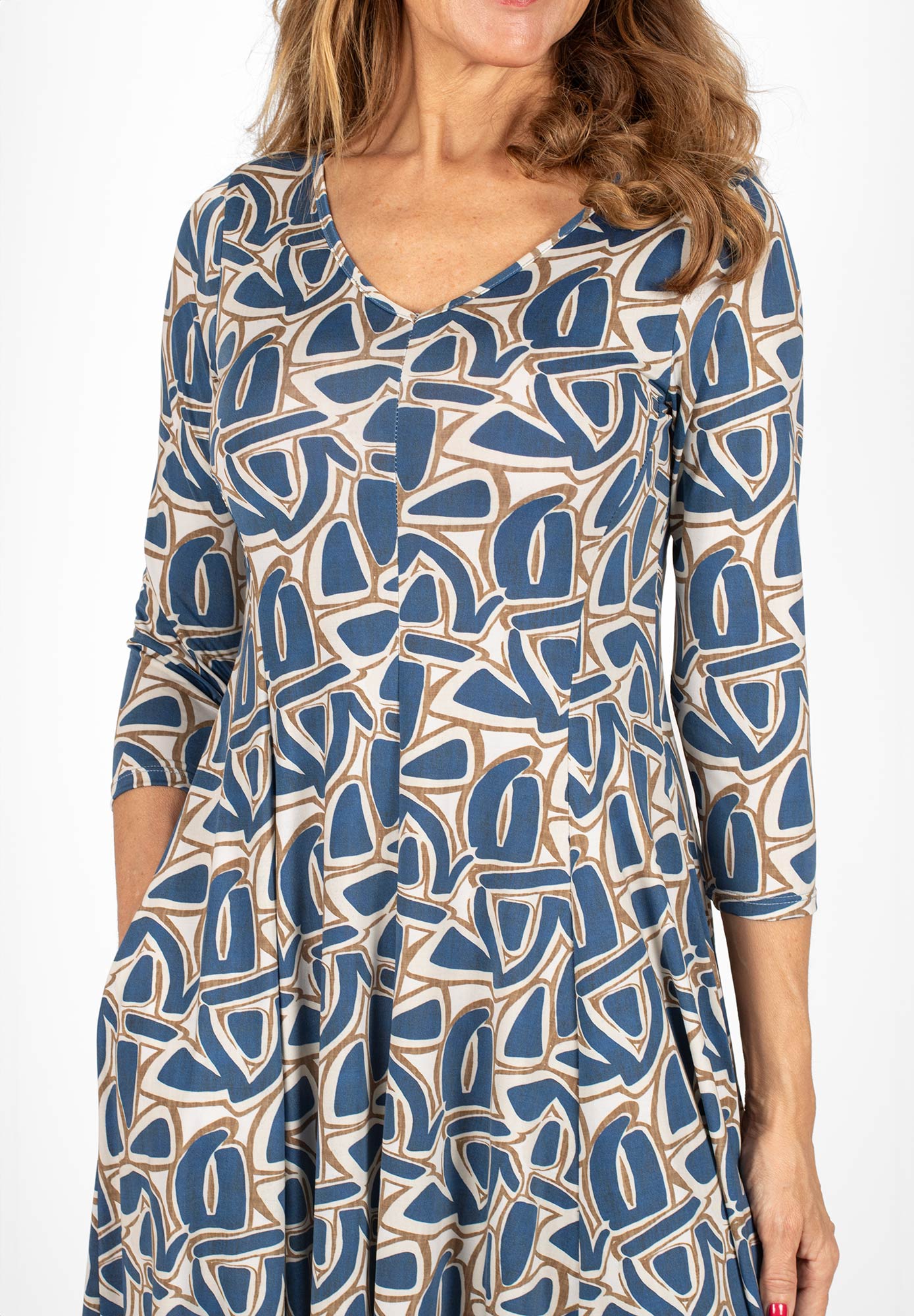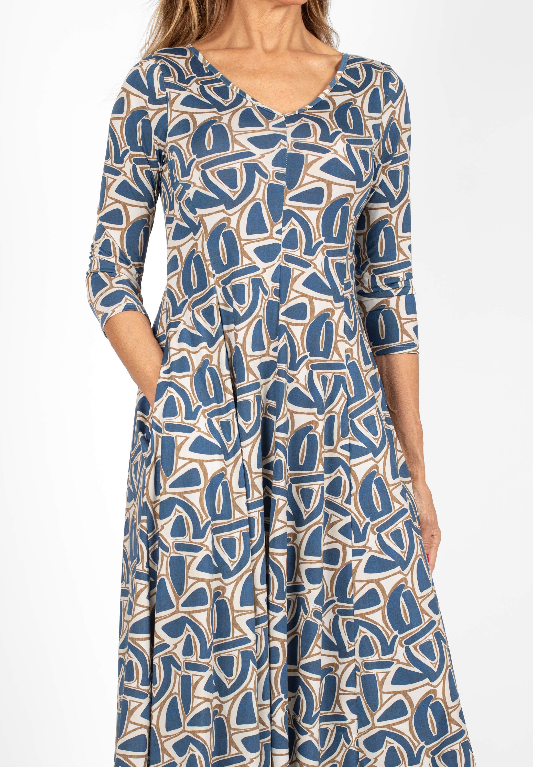 Klänningen har en figurnära överdel som sedan släpper i midjan som skapar ett fint fall. Vadlång a-linjeformad kjol med fickor i sidan. V-ringning samt trekvarts-ärm-