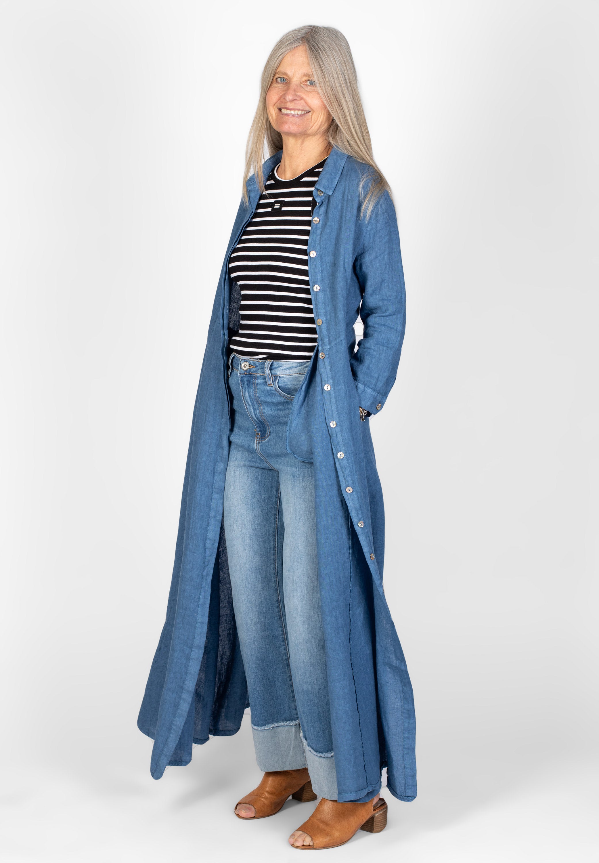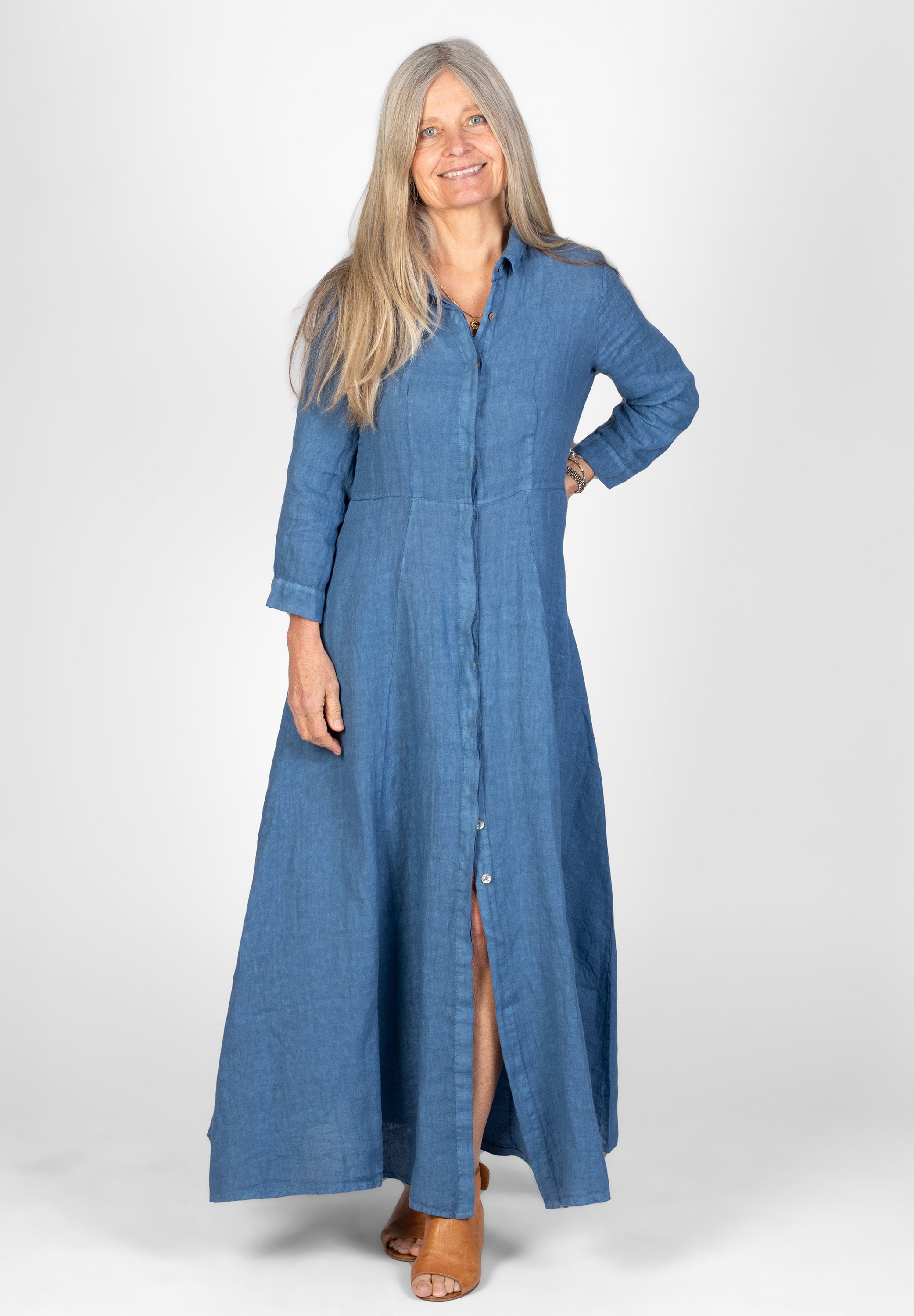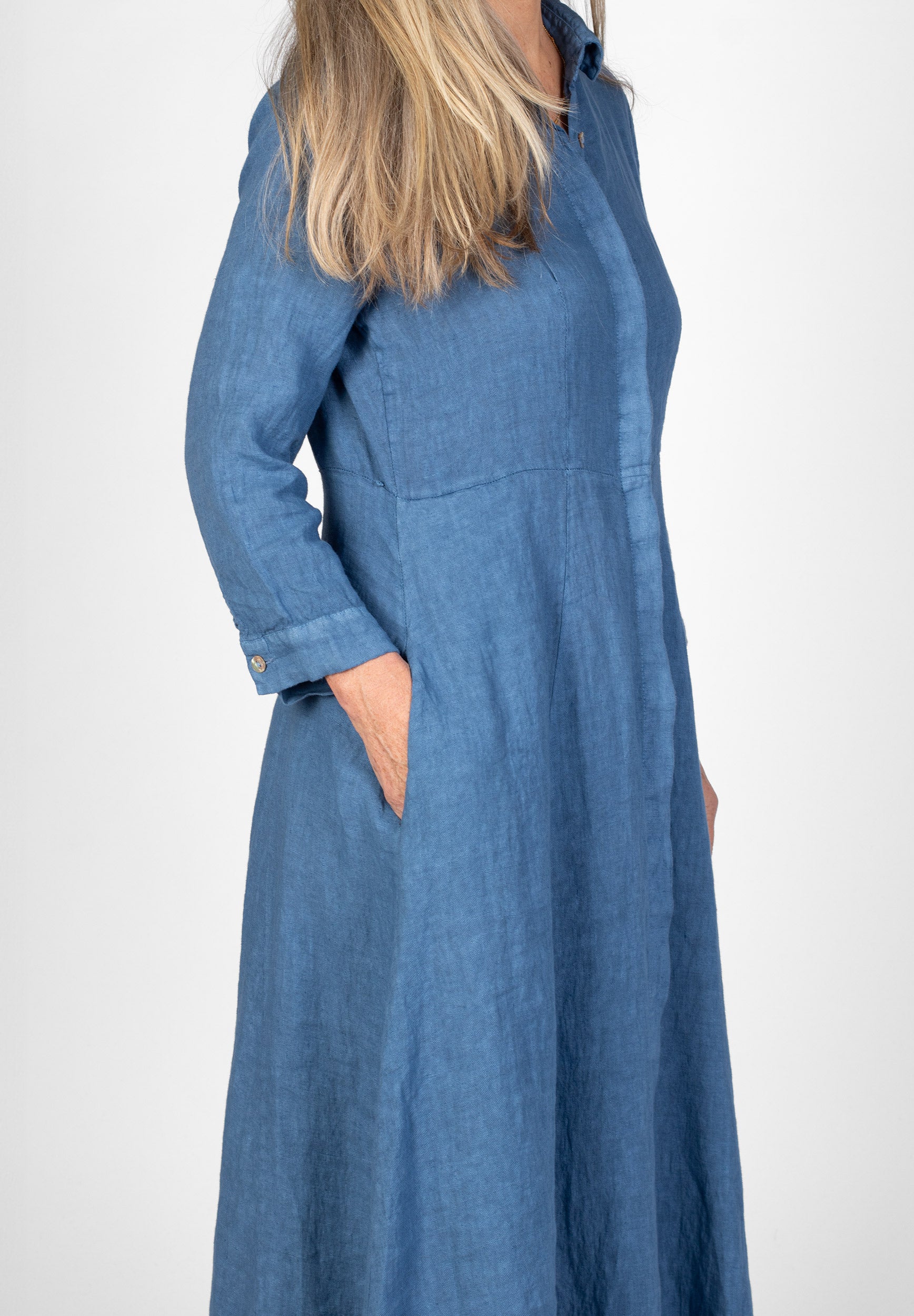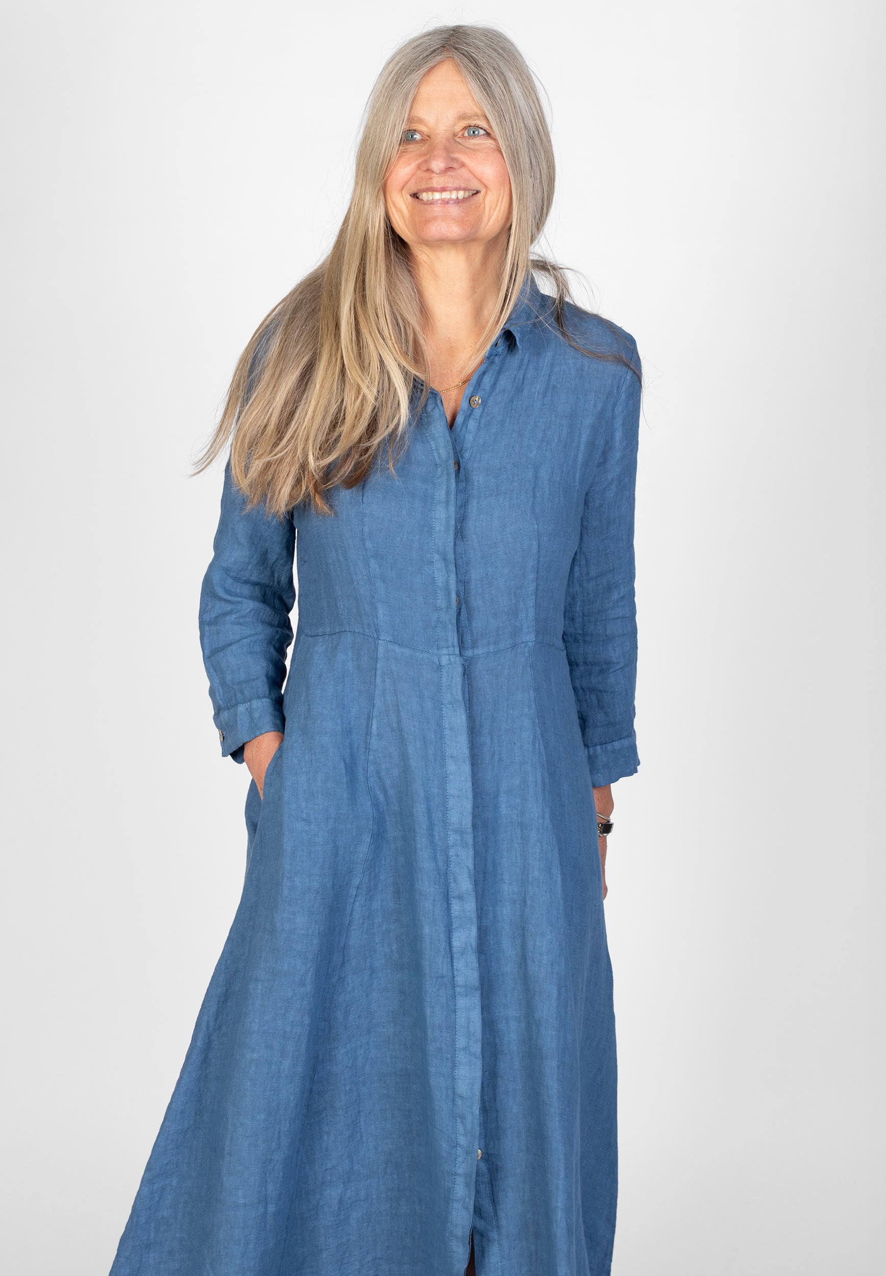 Lång skjortklänning med krage samt dold knäppning framtill. Avskuren vid midjan med utställd kjol med fickor. Trekvarts-ärm med knapp. Snygg att bära både stängd och öppen.