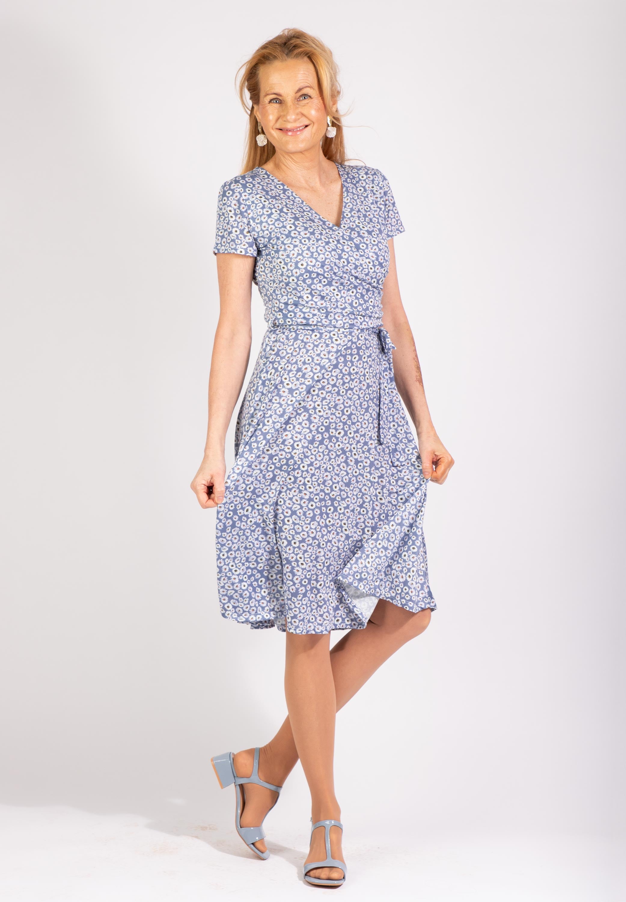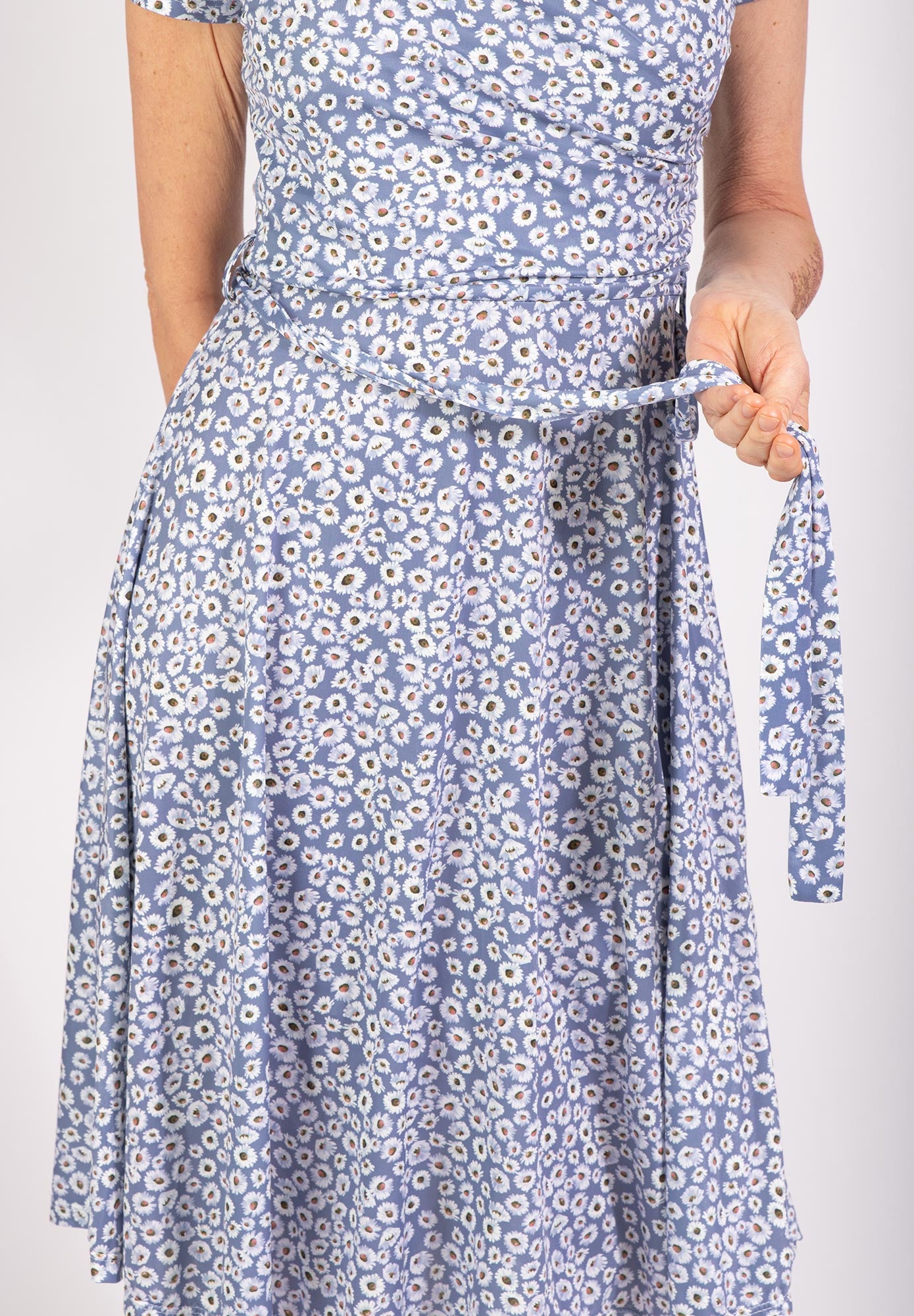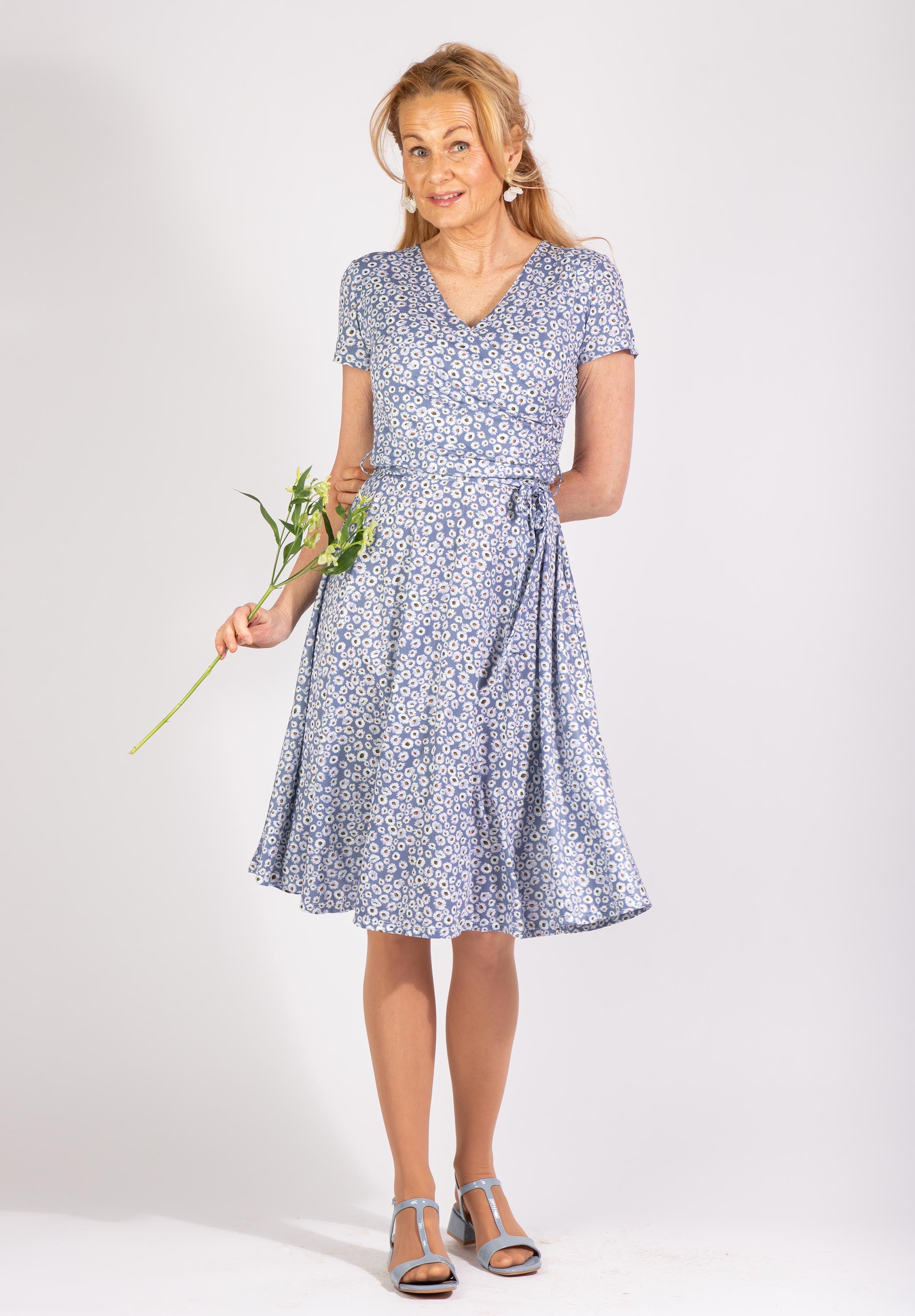 Duvblå midiklänning med blommigt mönster.