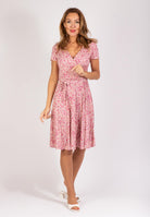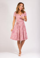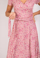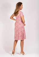 Rosa midiklänning med blommigt mönster.