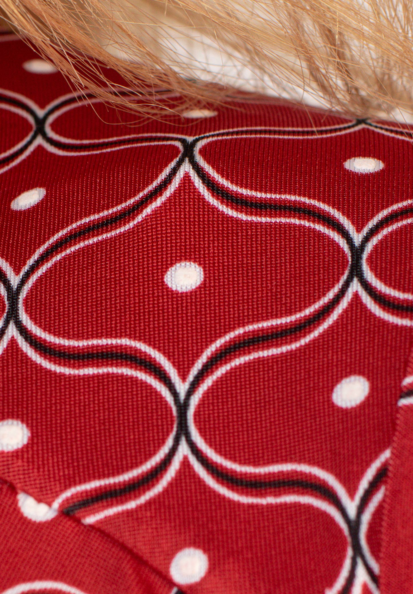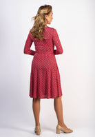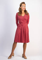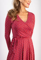 Klänningen har en figurnära draperad överdel som går i omlott. V-ringning och lång ärm. Klänningen är avskuren i midjan med en vid kjol. Avtagbart matchande skärp i midjan.