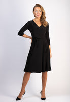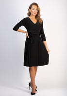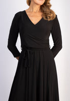 Klänningen har en figurnära draperad överdel som går i omlott. V-ringning och lång ärm. Klänningen är avskuren i midjan med en vid kjol. Avtagbart matchande skärp i midjan.