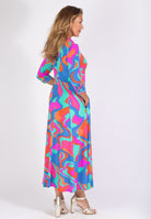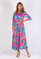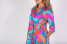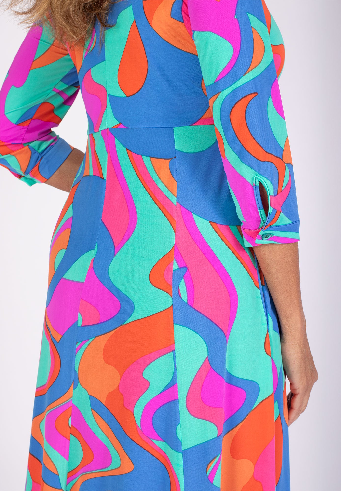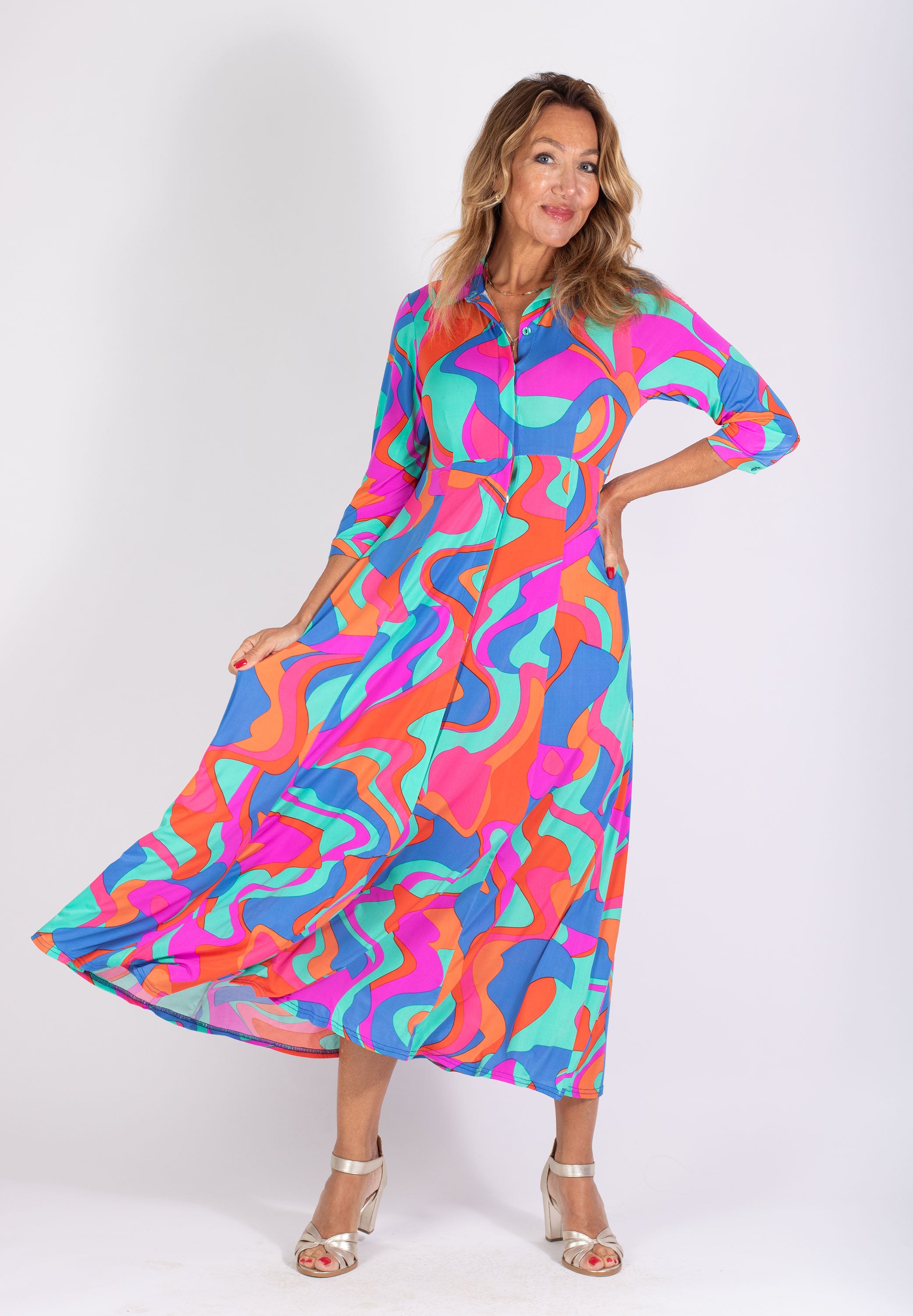 Lång skjortklänning med dold knäppning. Avskuren vid midja med utställd kjol med fickor. Snygg att bära både stängd och öppen.
