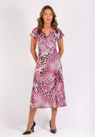 Freja är en midiklänning med V-ringning och formsydda kupor. Den är avskuren under bysten och har en kort holkärm.