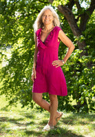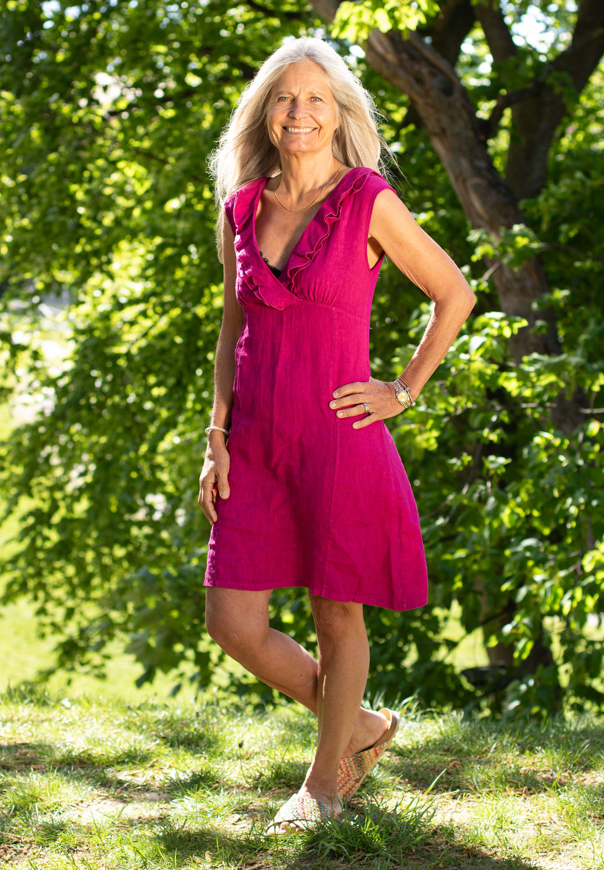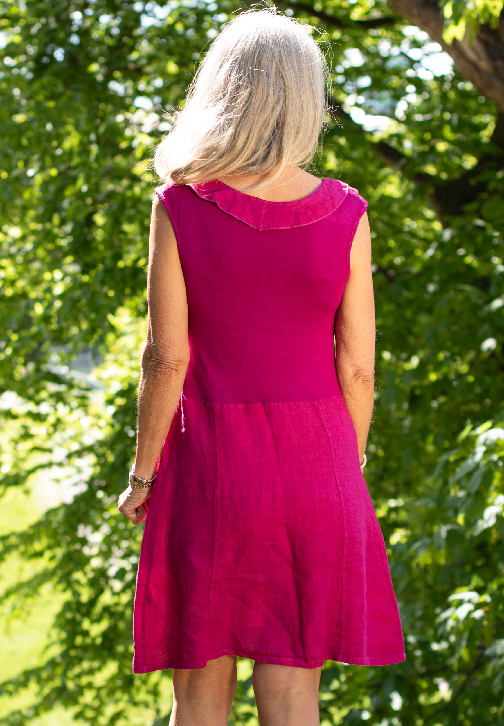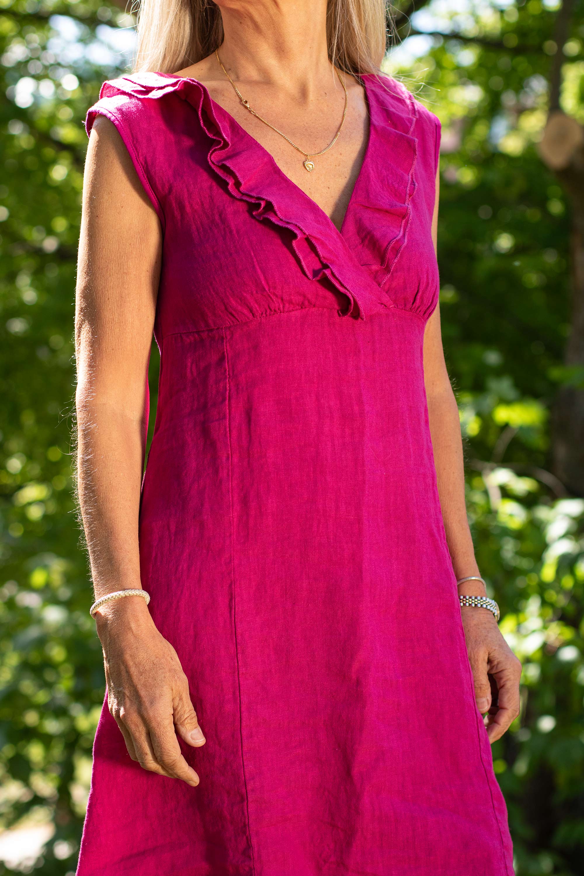Marbella är en ärmlös miniklänning i linne framtill och mjuk viskos baktill. Den naturliga linnestrukturen ger klänningen en sval och exklusiv känsla, medan viskosen i ryggen ger extra komfort. Klänningen är V-ringad med volang längst ringningen.