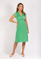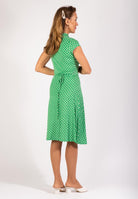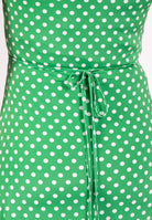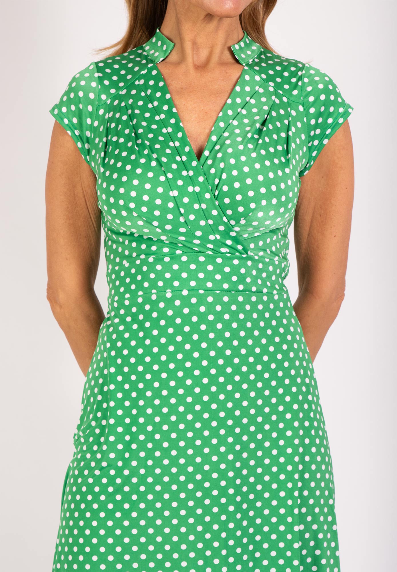 Klänningen har en figurnära överdel som ger en smickrande siluett och kort ärm. V-ringning med en stående krage. Avskuren i midjan med ett smalt band som knyts bak i ryggen.