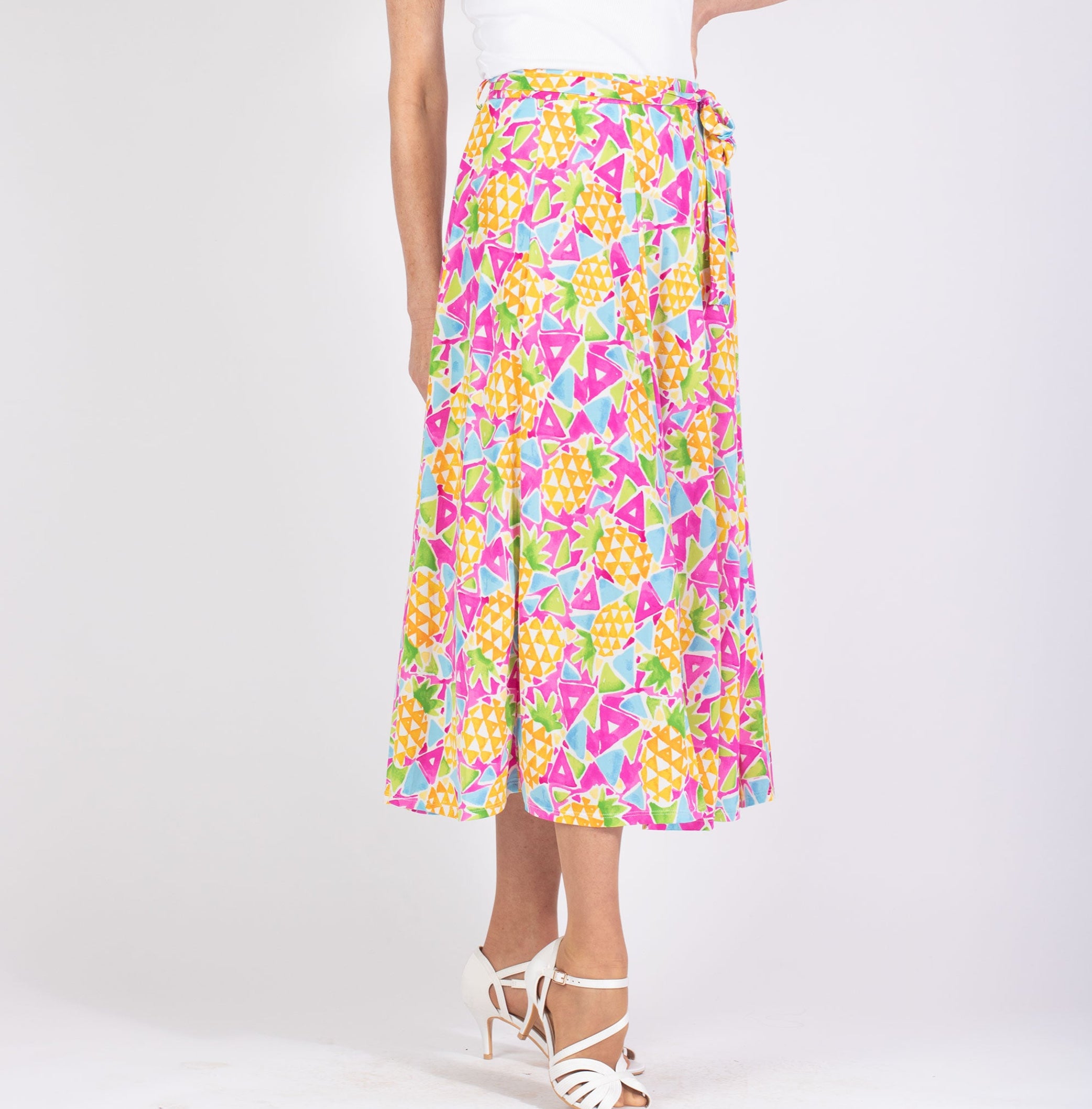 Vadlång kjol med resår i midjan. Hällor i sidan med avtagbart knytband.