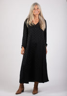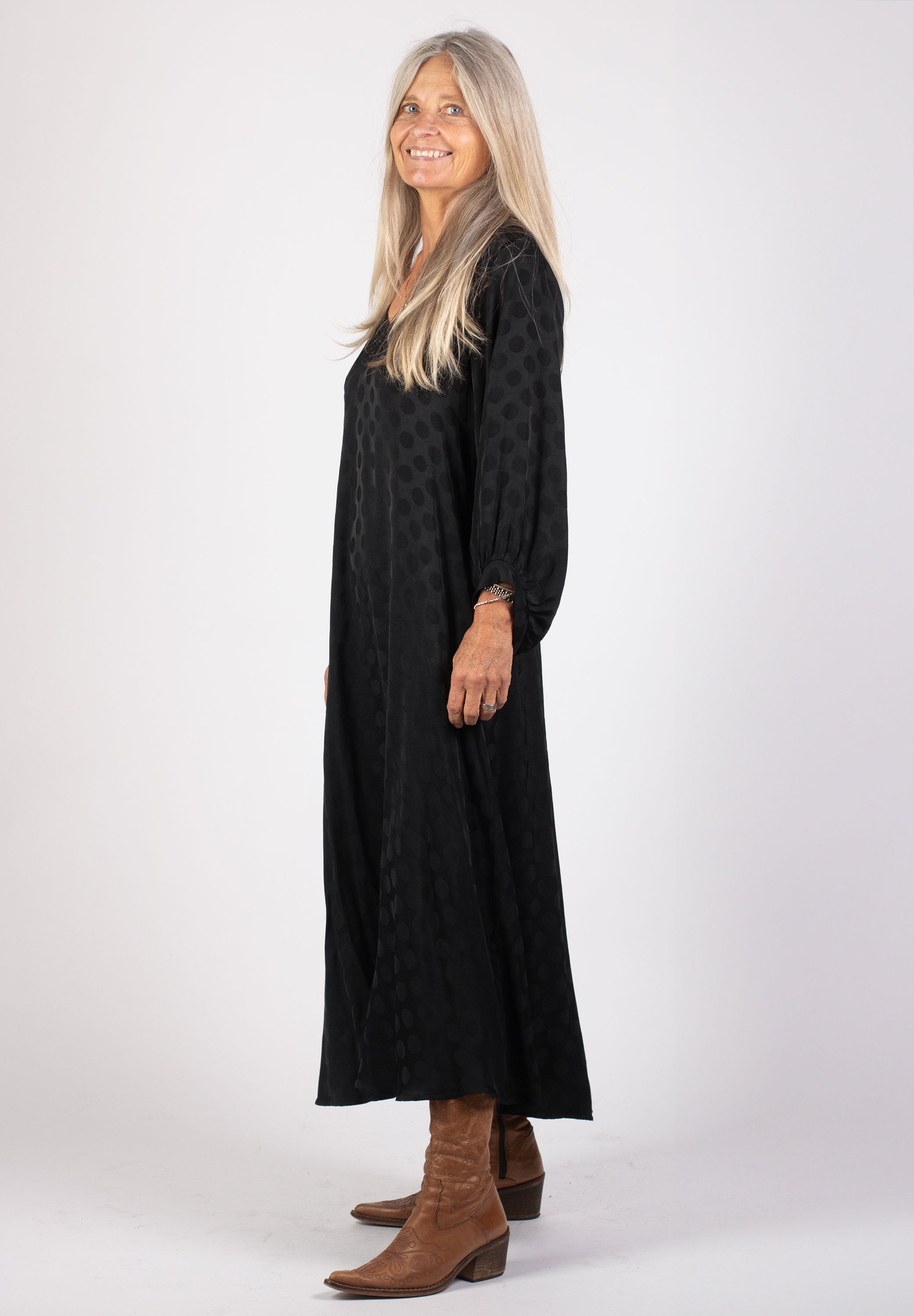 This oversized a-line dress has a v-neck, balloon sleeves and subtle pockets on each side.