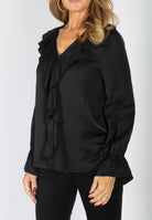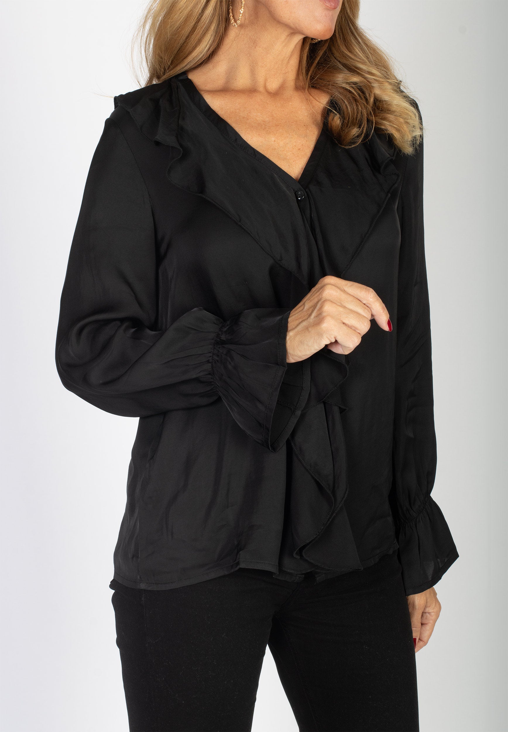 Svea är en feminin blus med knappar och vacker volang längs den V-ringade halsen. De långa ärmarna har resår vid ärmslutet som skapar en mjuk volang även där. Blusen är gjord i ett glansigt satinvävt viskostyg för en lyxig känsla och ett fint fall.