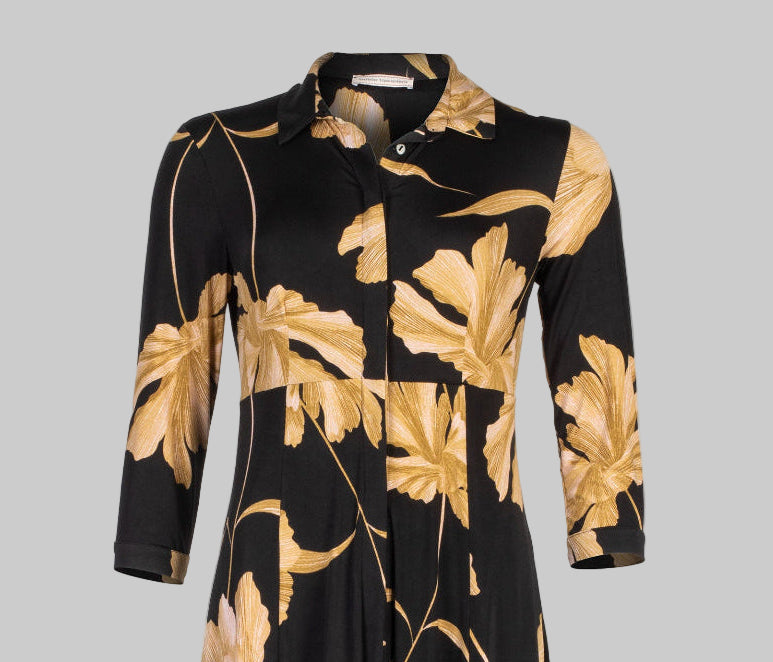 Lång skjortklänning med dold knäppning. Avskuren vid midja med utställd kjol med fickor. Snygg att bära både stängd och öppen.
