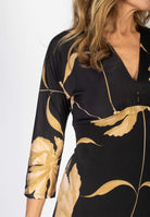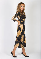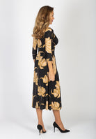 Freja är en midiklänning med V-ringning och formsydda kupor. Avskuren under bysten och har lång ärm.