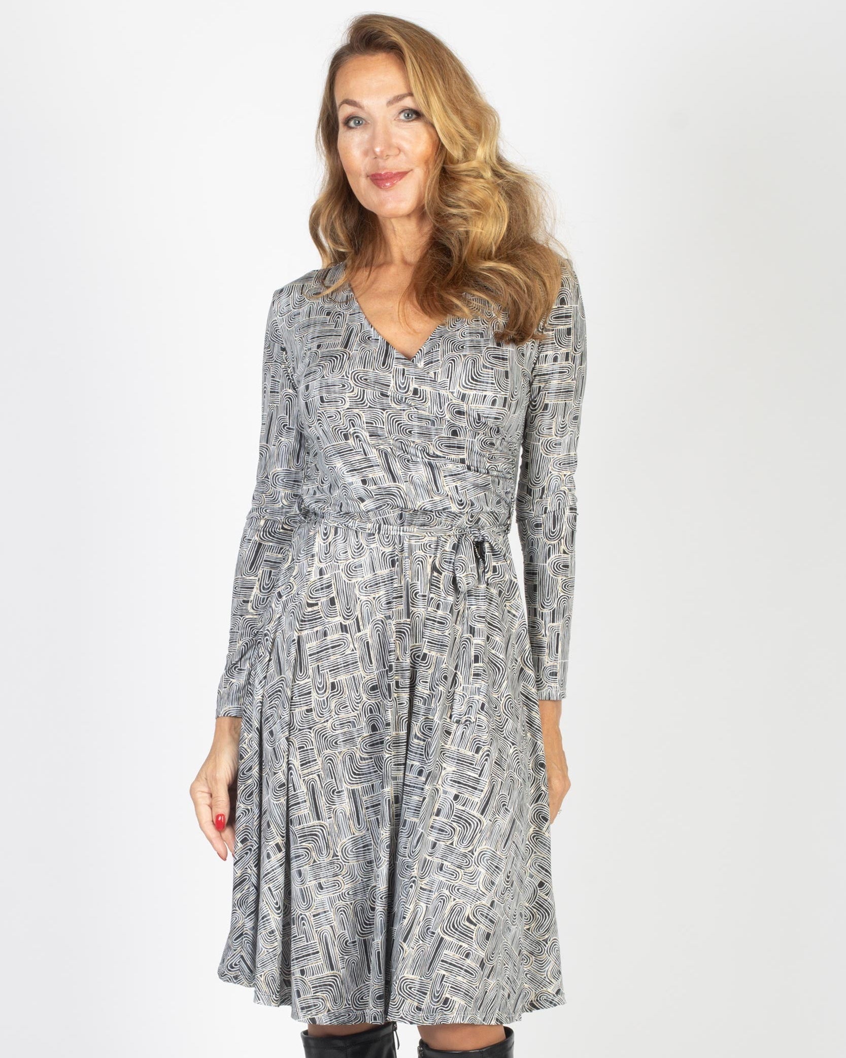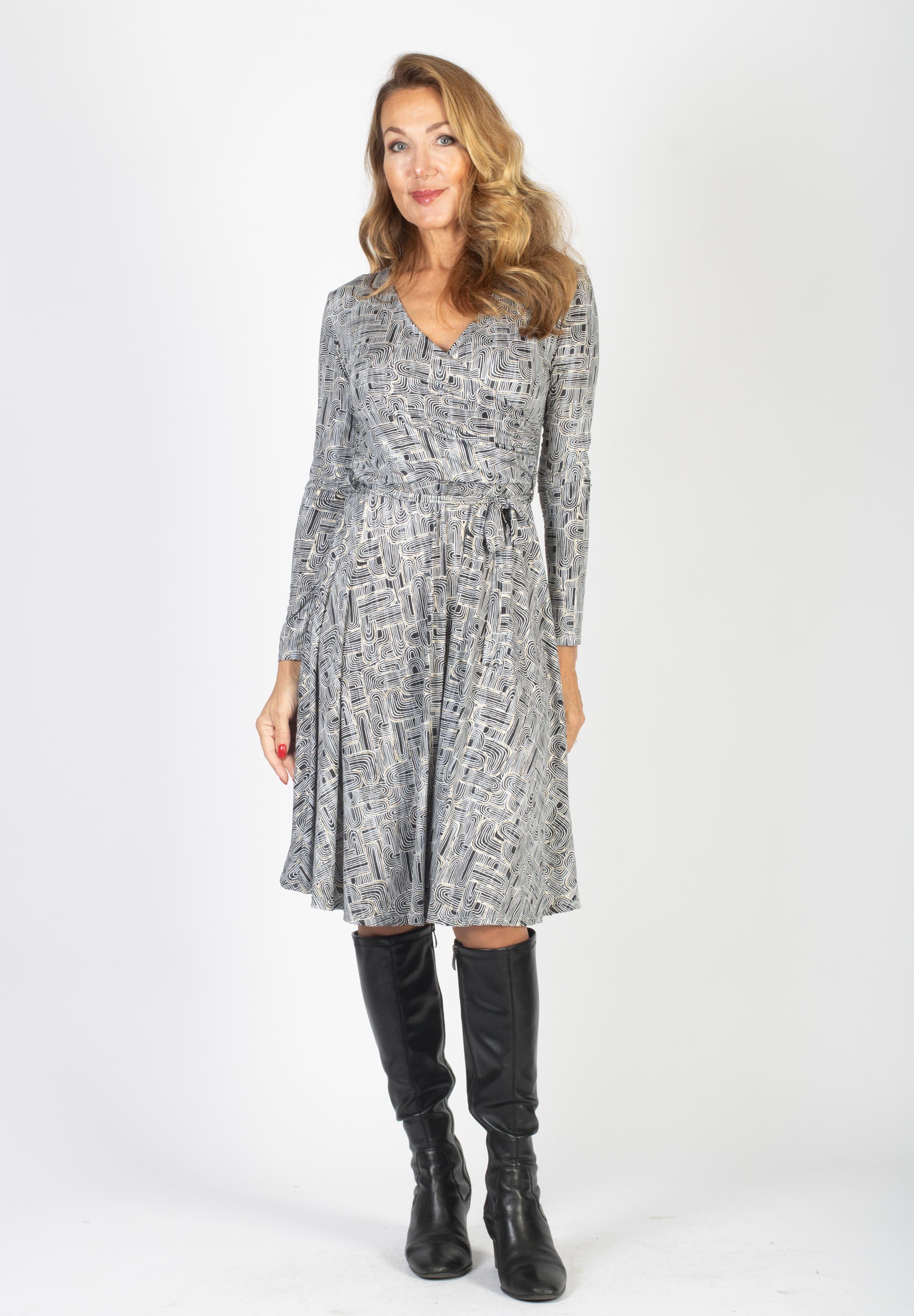 Klänningen har en figurnära draperad överdel som går i omlott. V-ringning och lång ärm. Klänningen är avskuren i midjan med en vid kjol. Avtagbart matchande skärp i midjan.