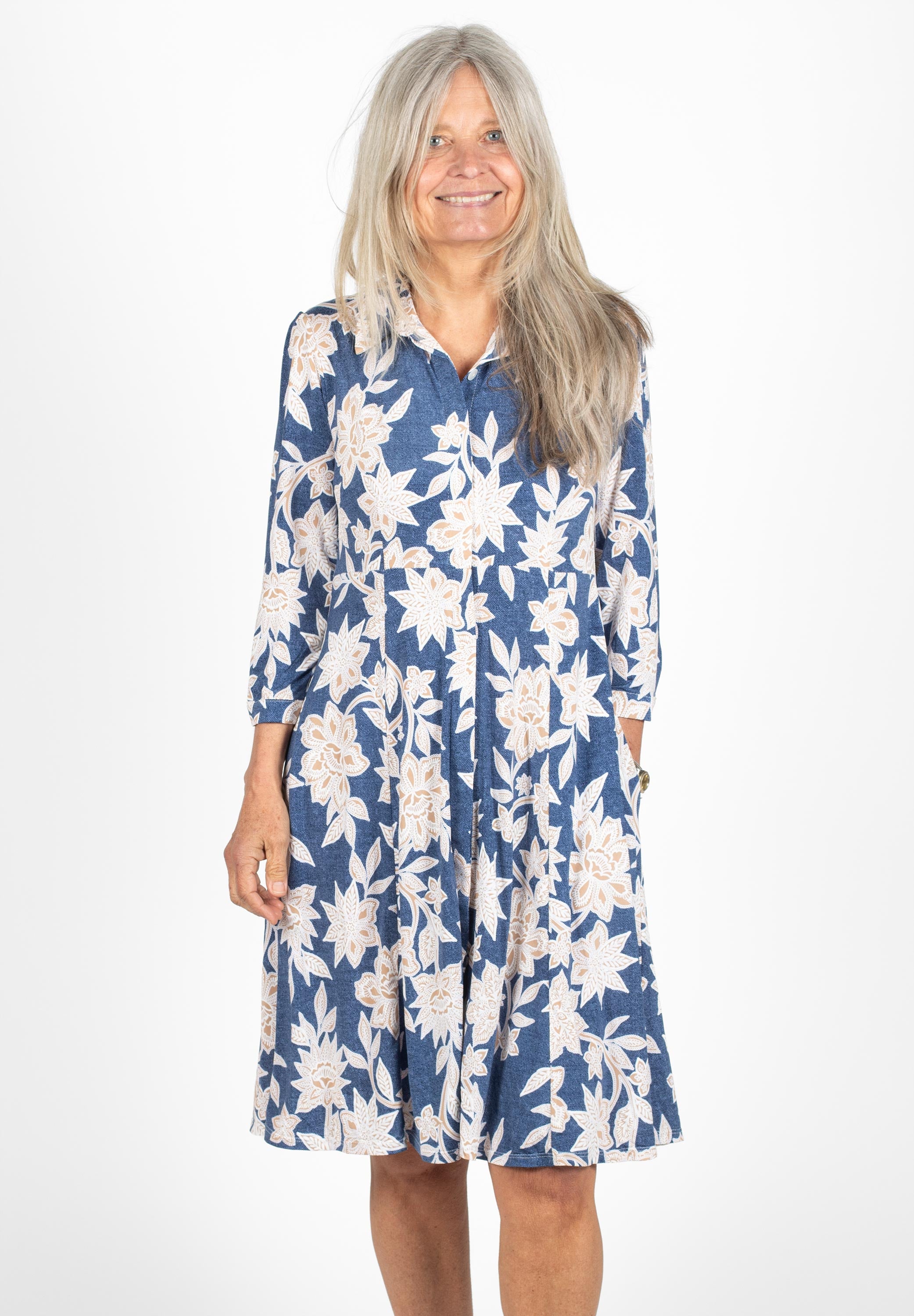 Kort skjortklänning med dold knäppning. Avskuren vid midja med utställd kjol med fickor. Snygg att bära både stängd och öppen.