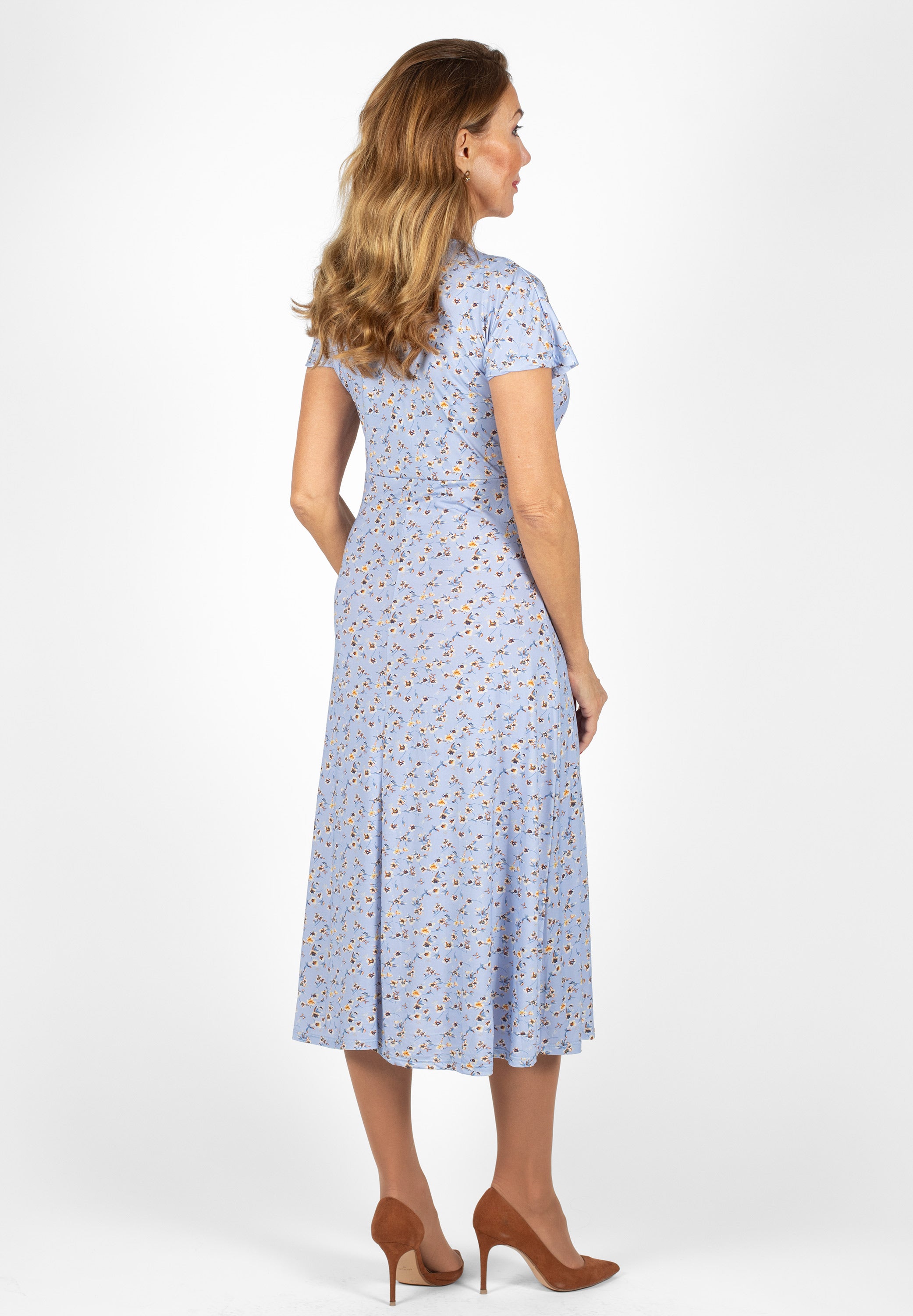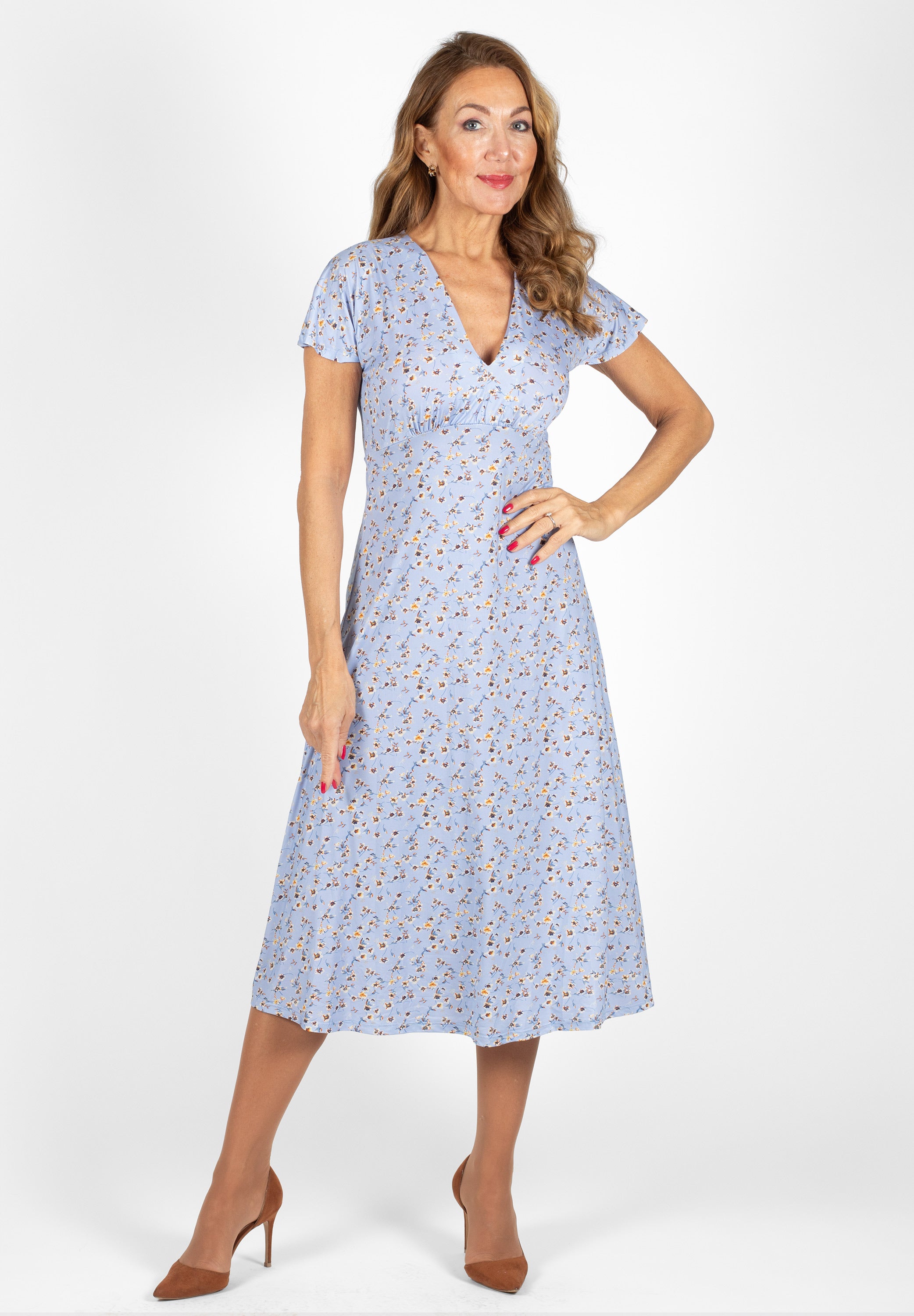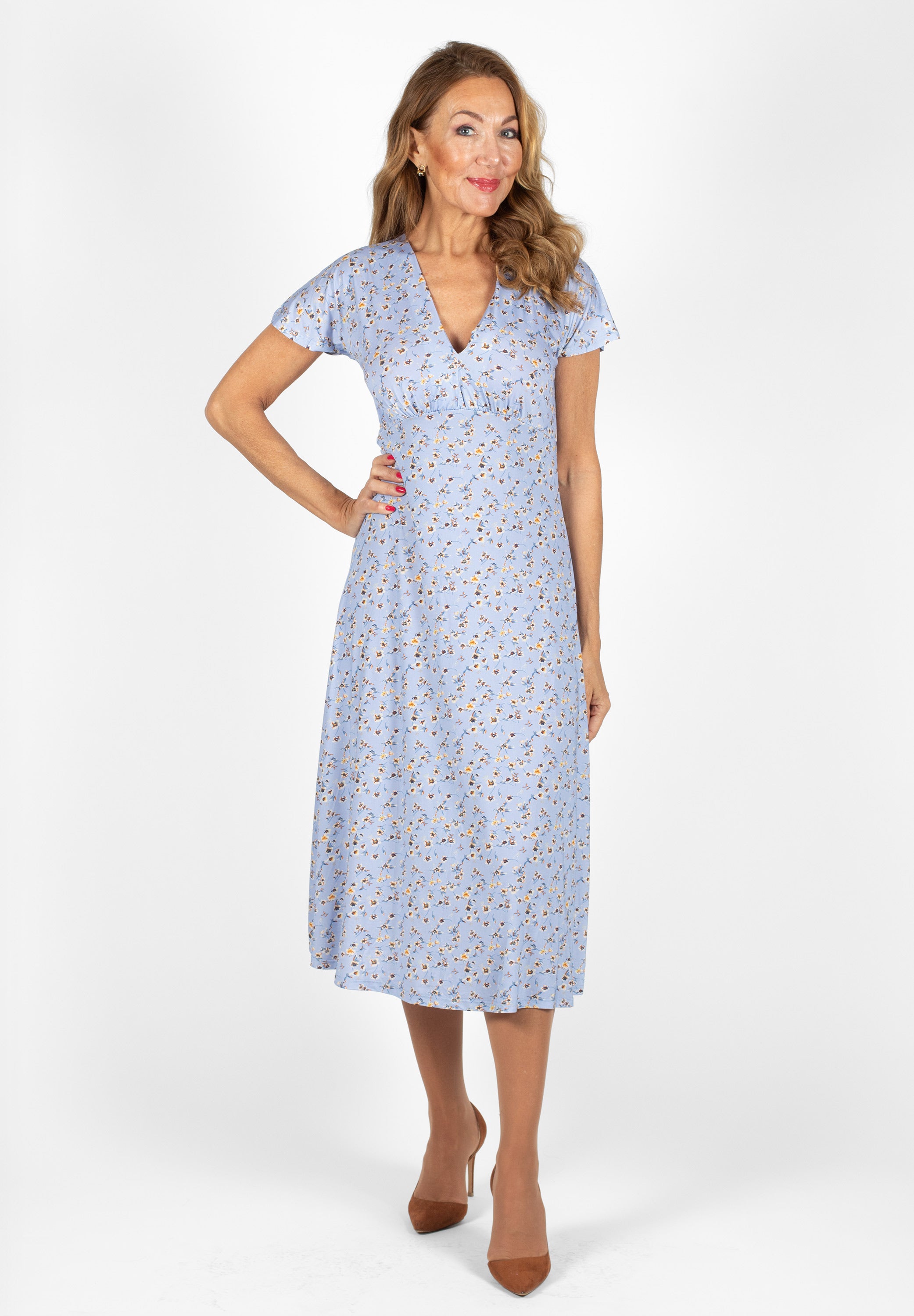 Freja is a midi dress with a V-neckline and molded cups. Cut off below the bust and has long sleeves.