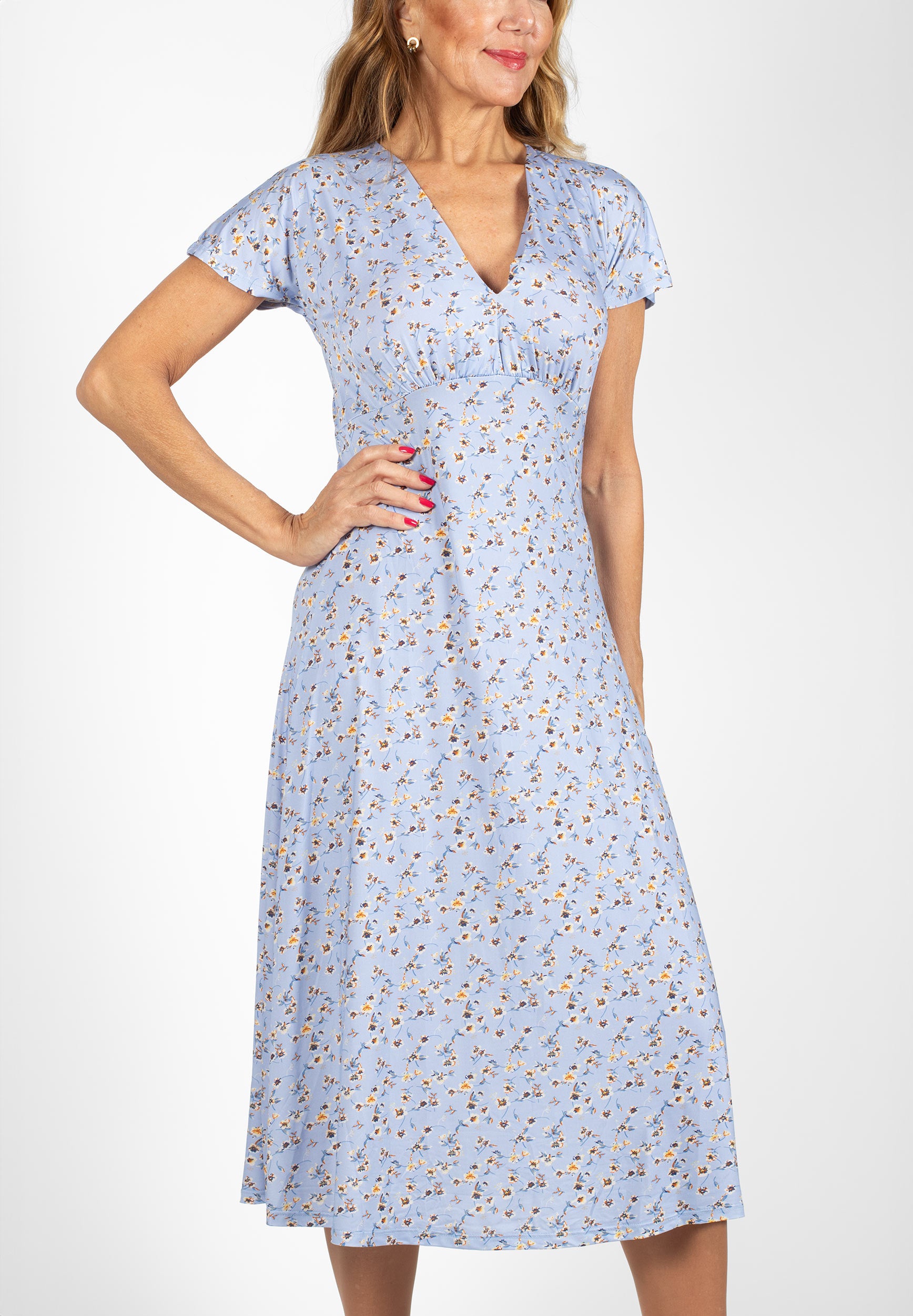 Dress with a deep V-neck and shaped cups.