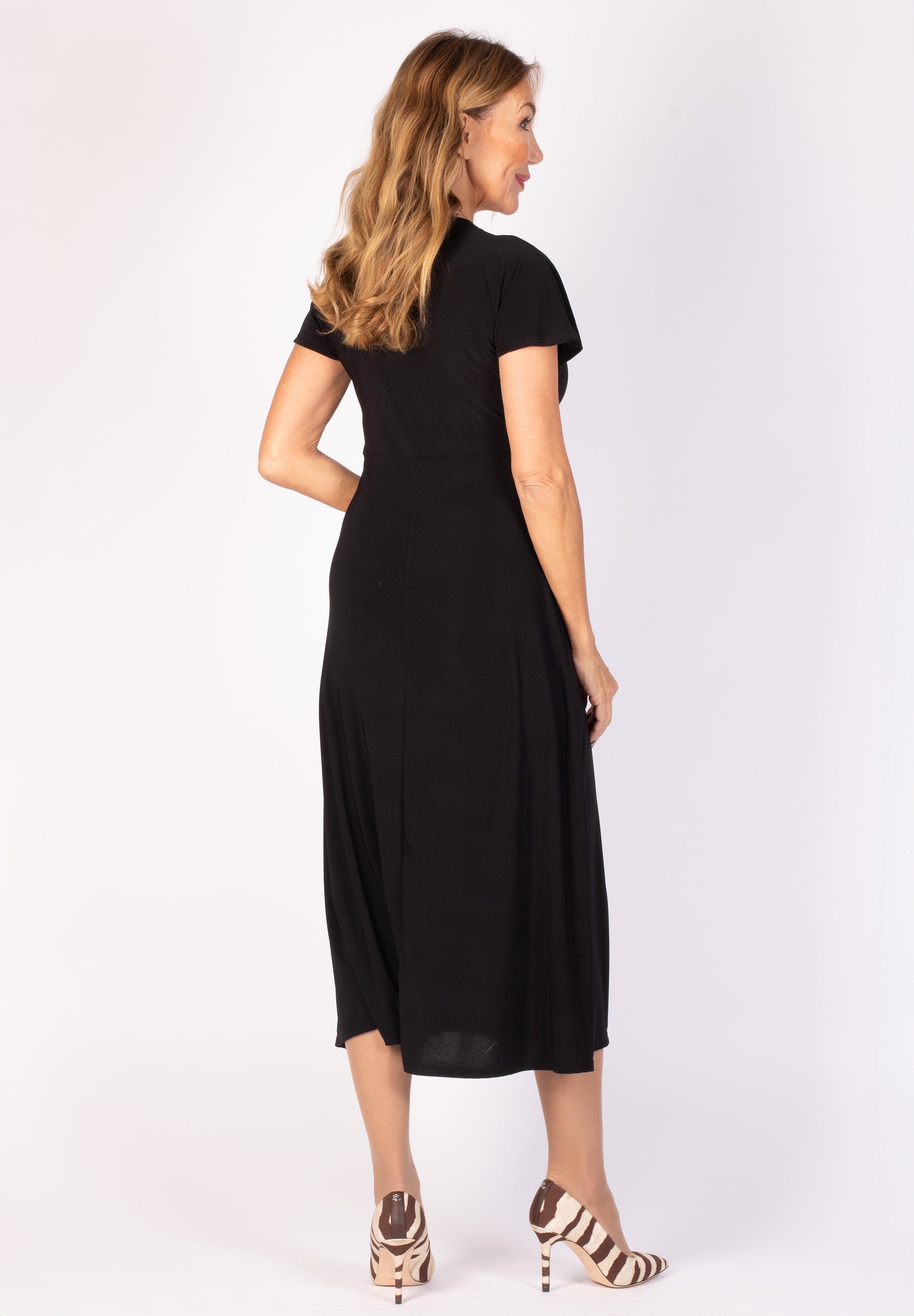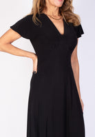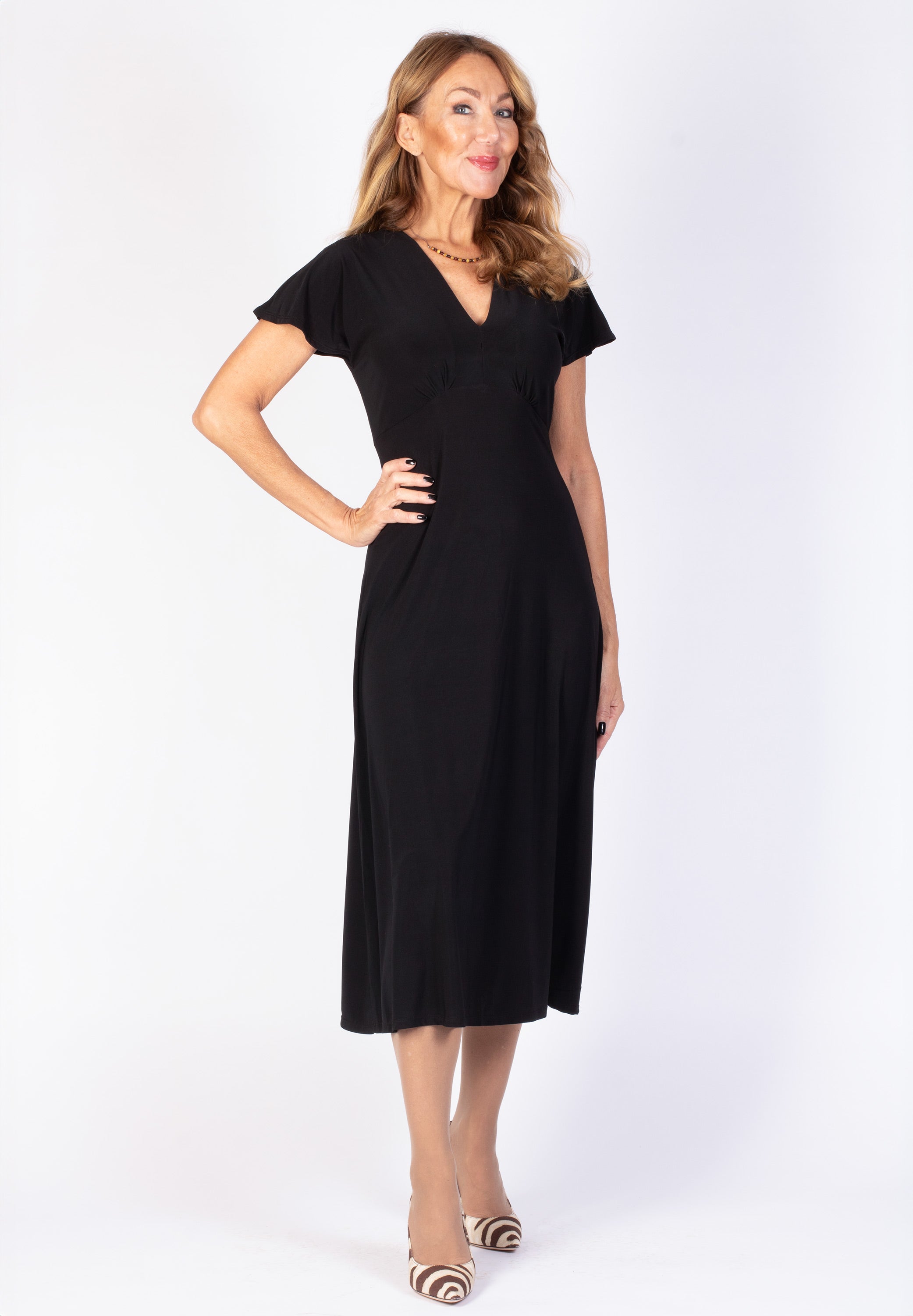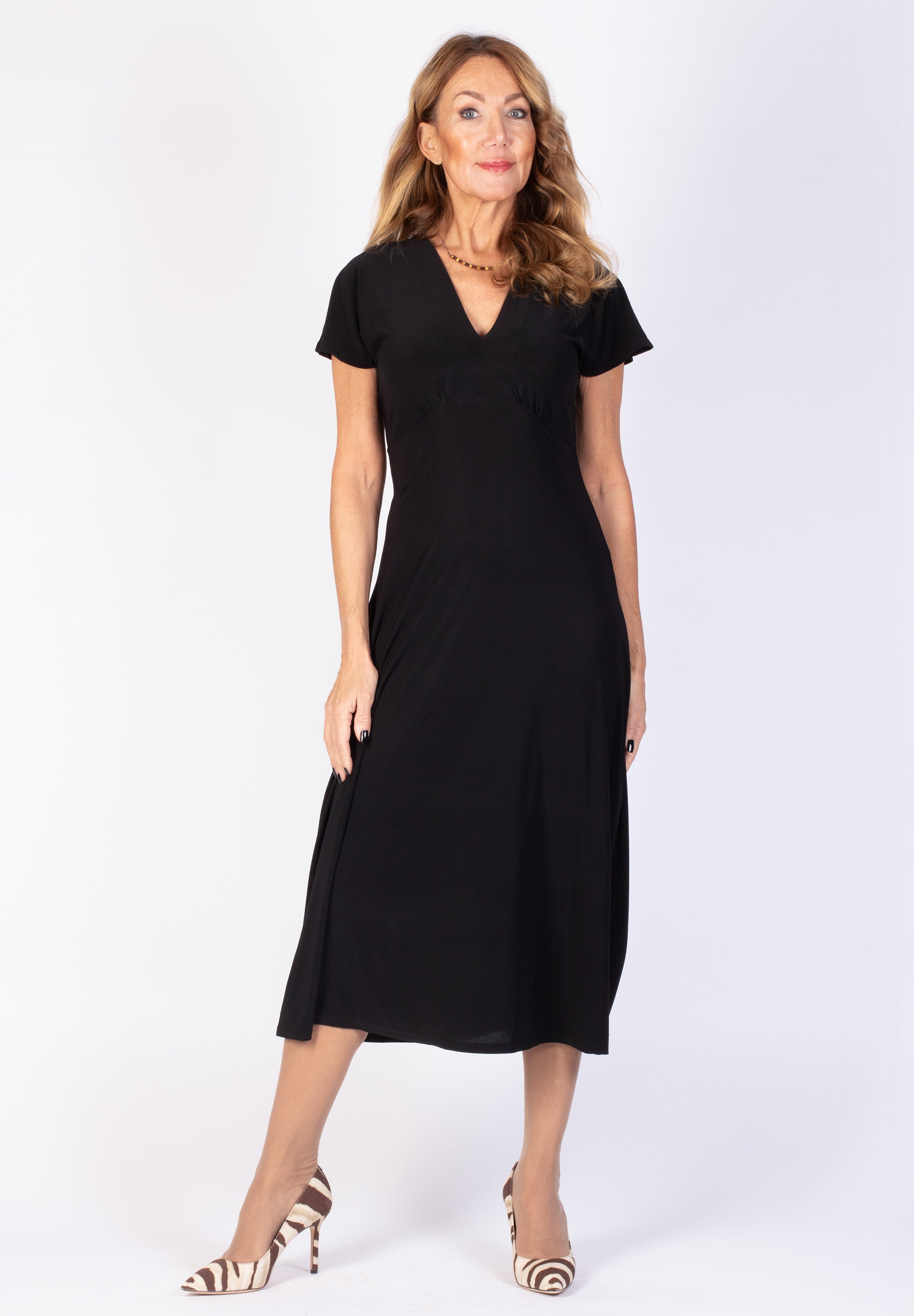 Freja är en midiklänning med V-ringning och formsydda kupor. Den är avskuren under bysten och har en kort holkärm.