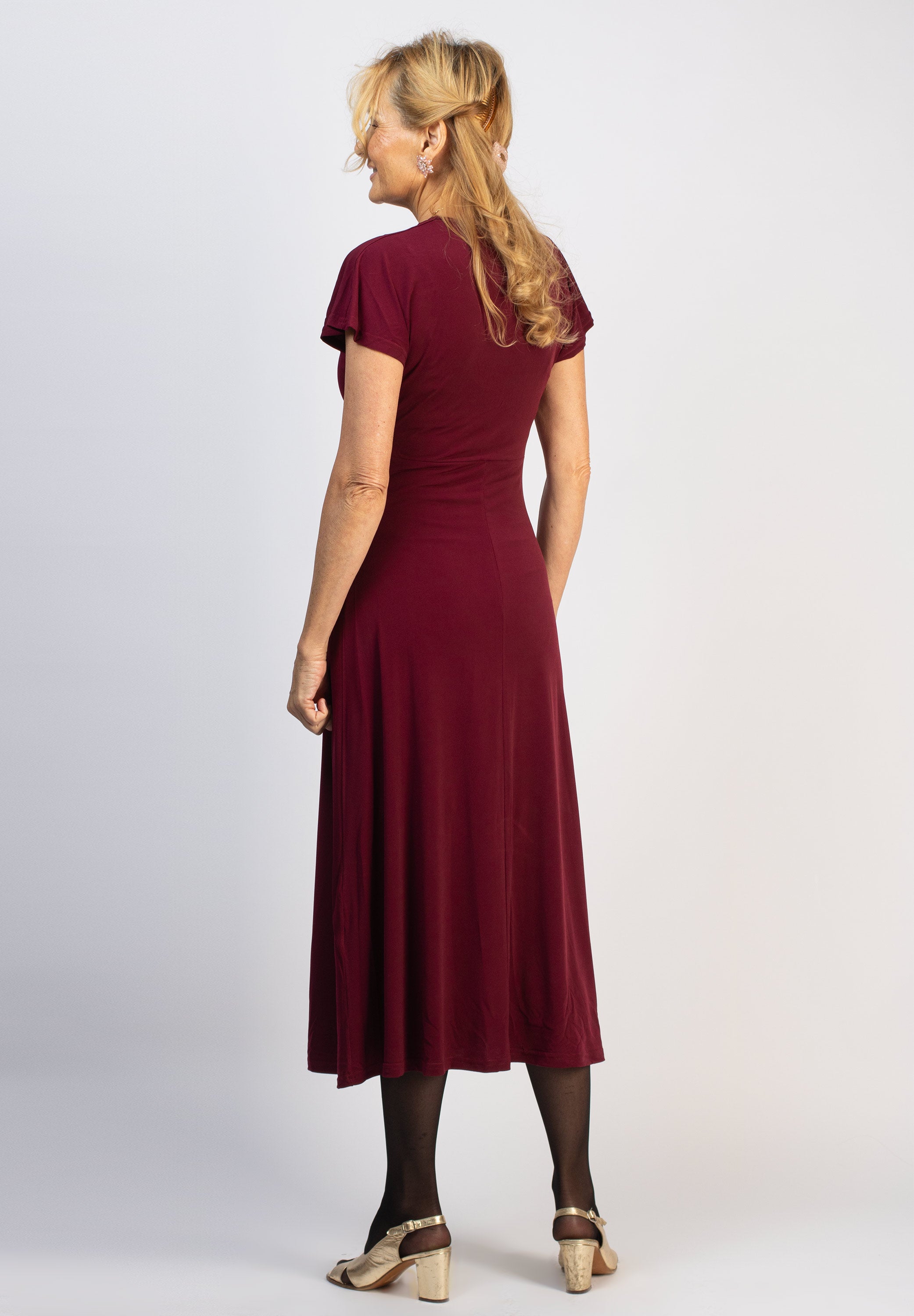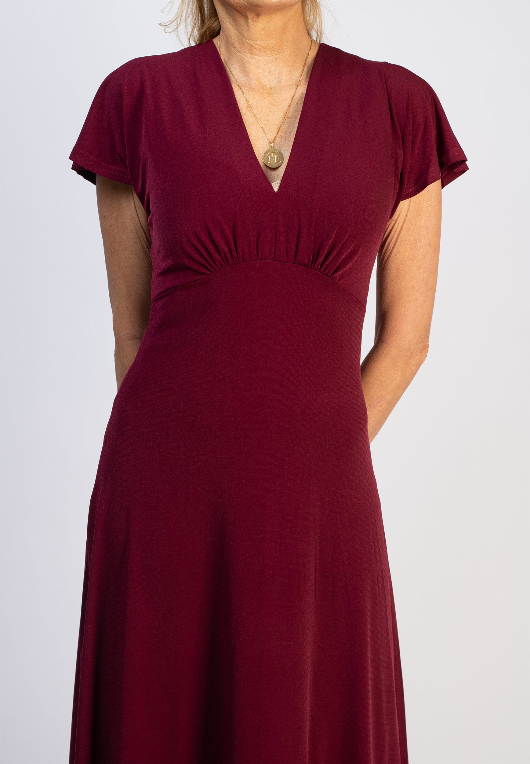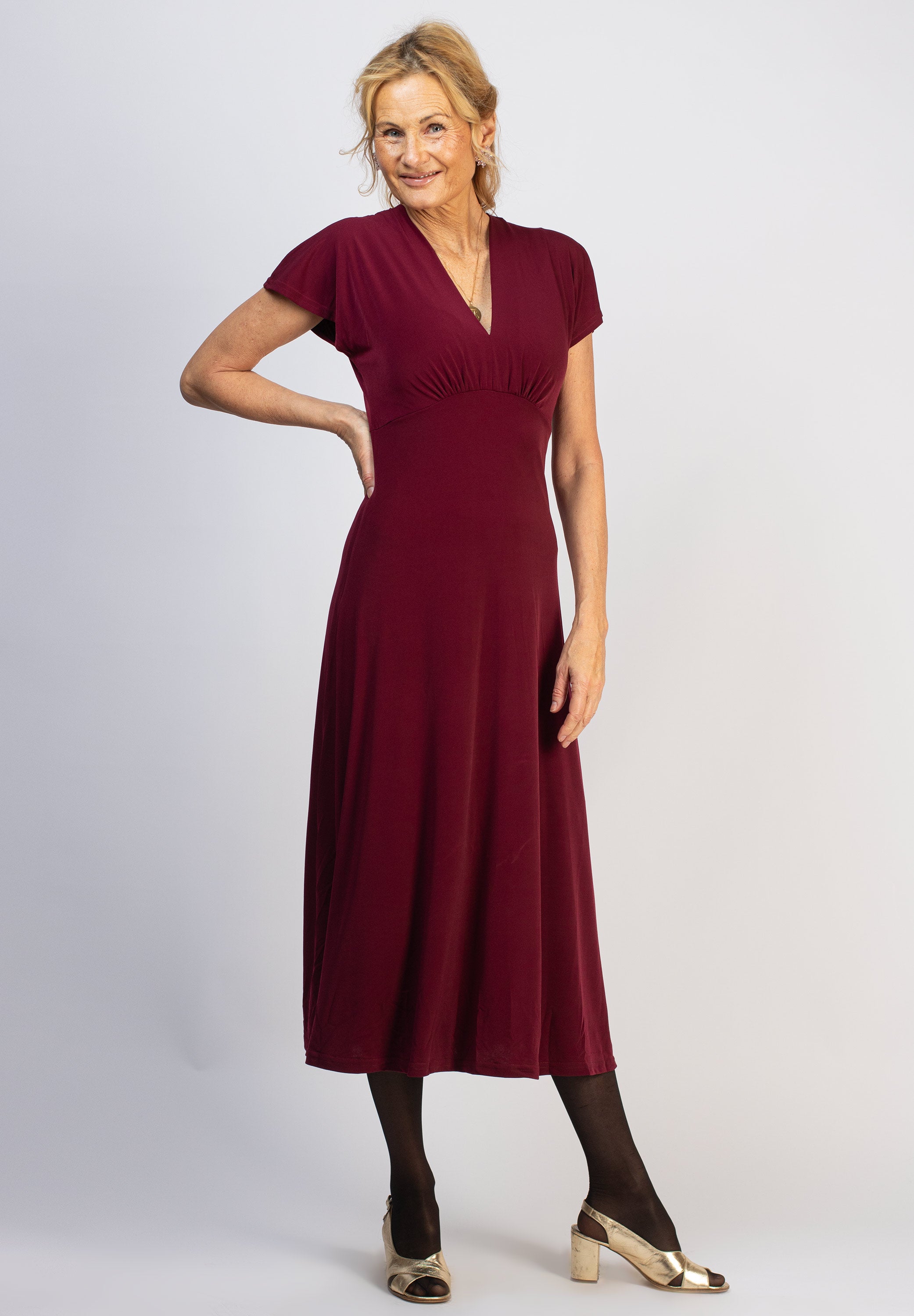 Freja är en midiklänning med V-ringning och formsydda kupor som ger en smickrande, figurnära siluett. Den är avskuren under bysten för att framhäva en feminin passform.