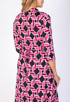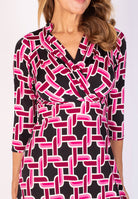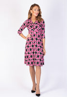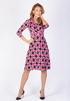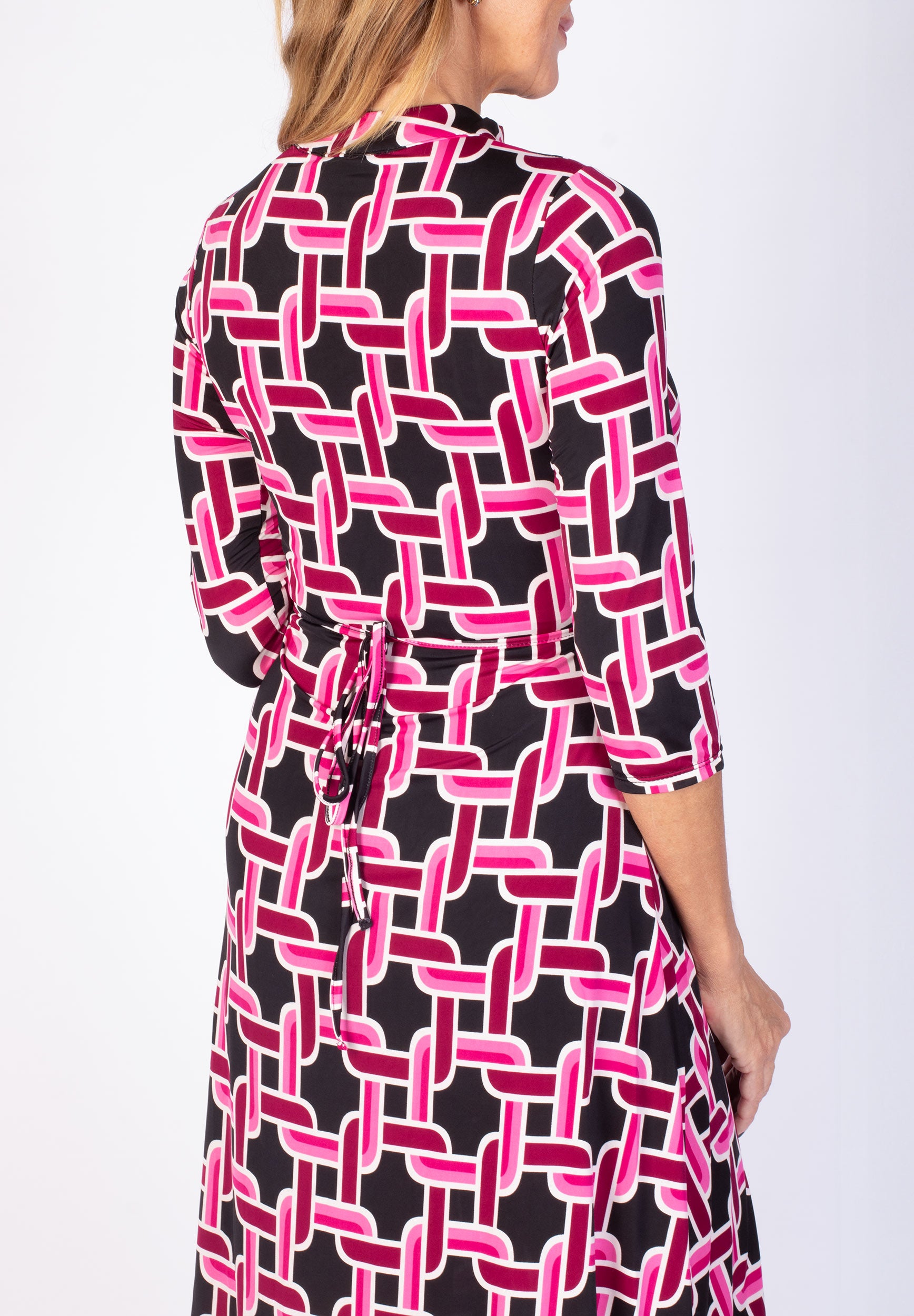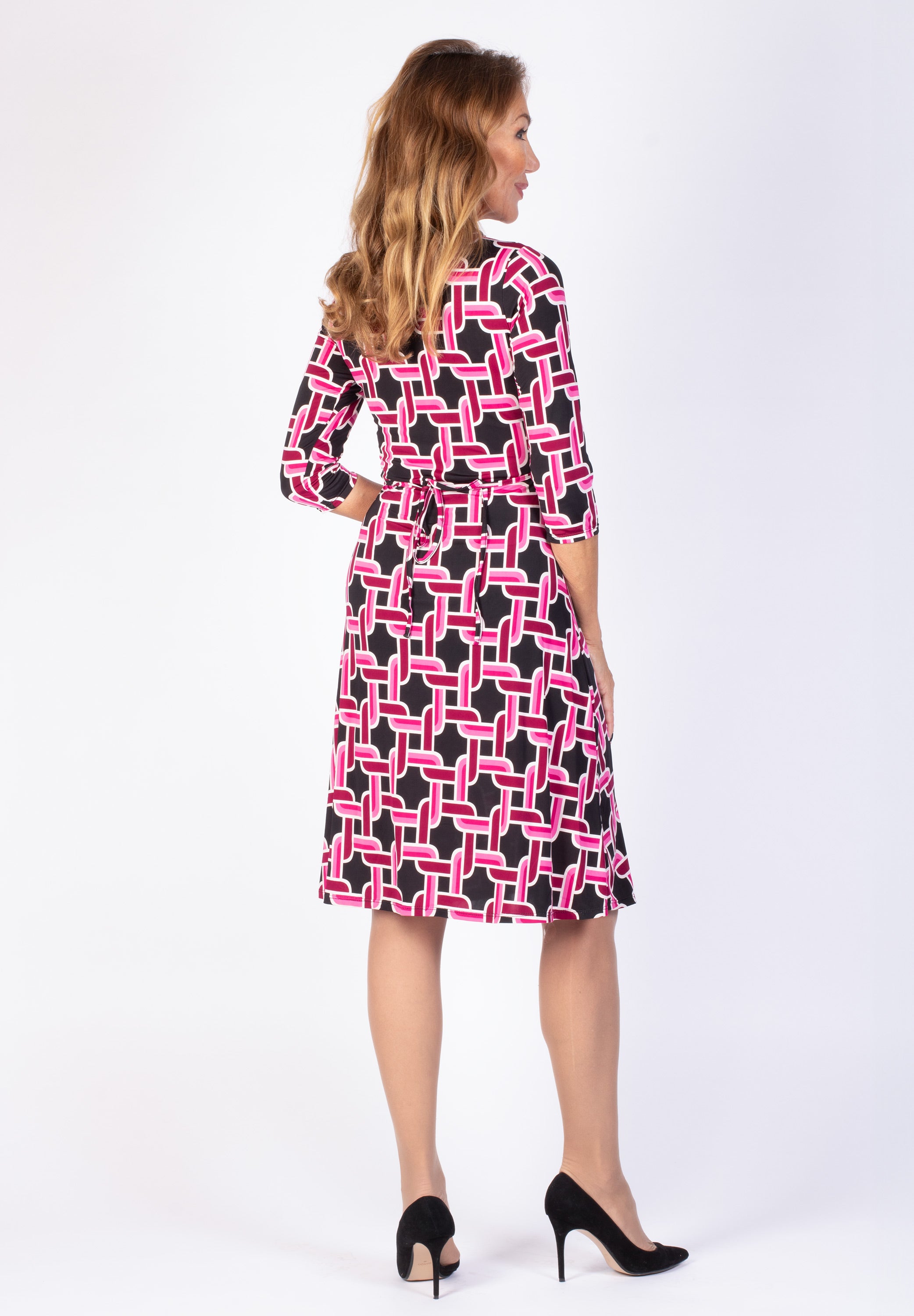 Klänningen har en figurnära överdel som ger en smickrande siluett och lång ärm. V-ringning med en stående krage. Avskuren i midjan med ett smalt band som knyts bak i ryggen.