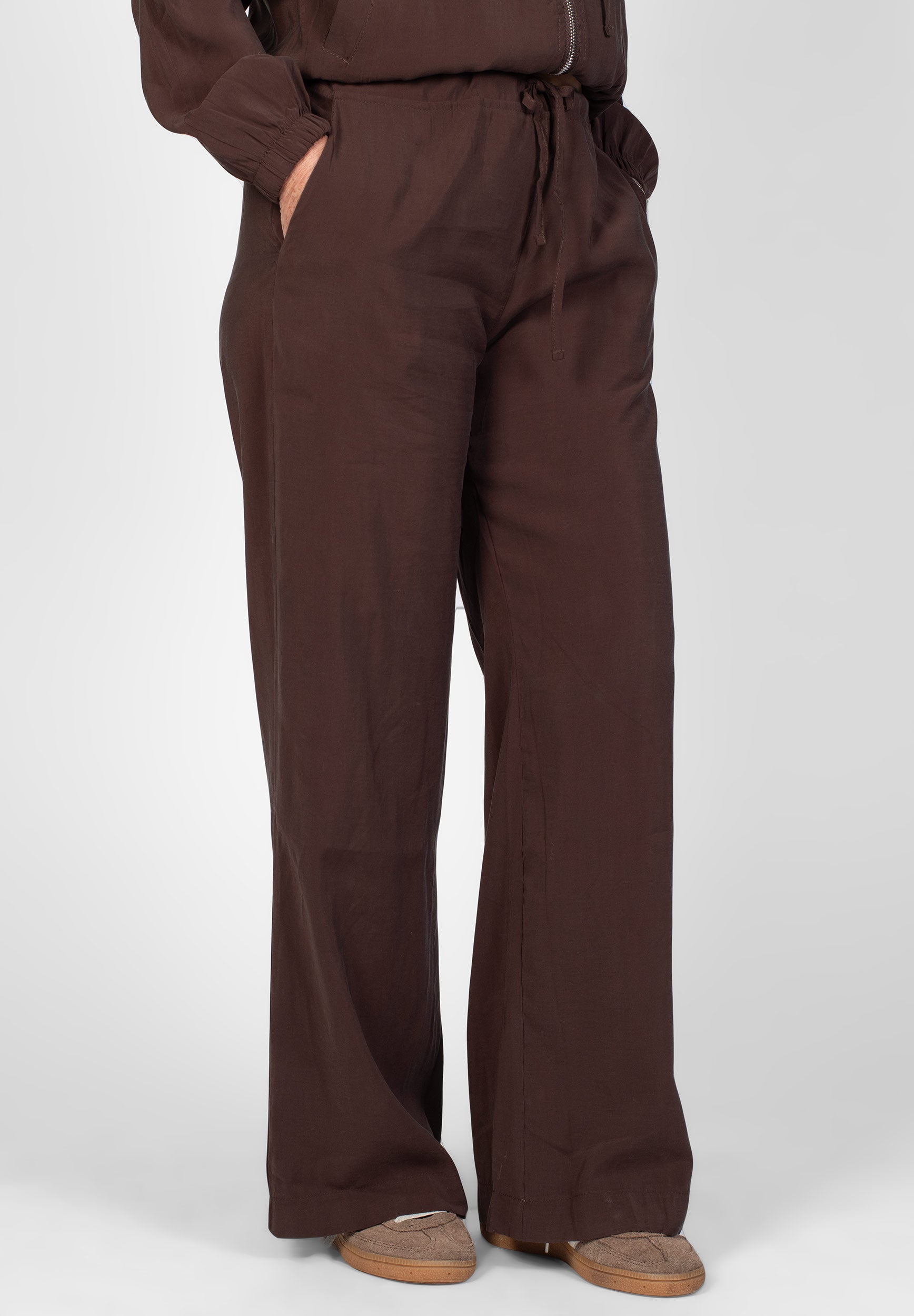 Avslappade byxor med vida ben. Resår och knyt i midjan. Fickor.