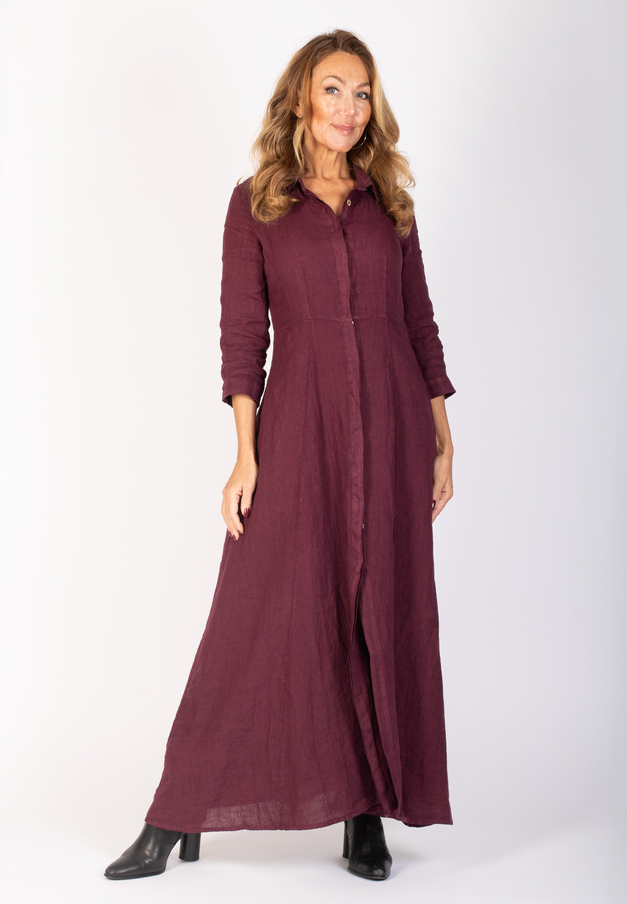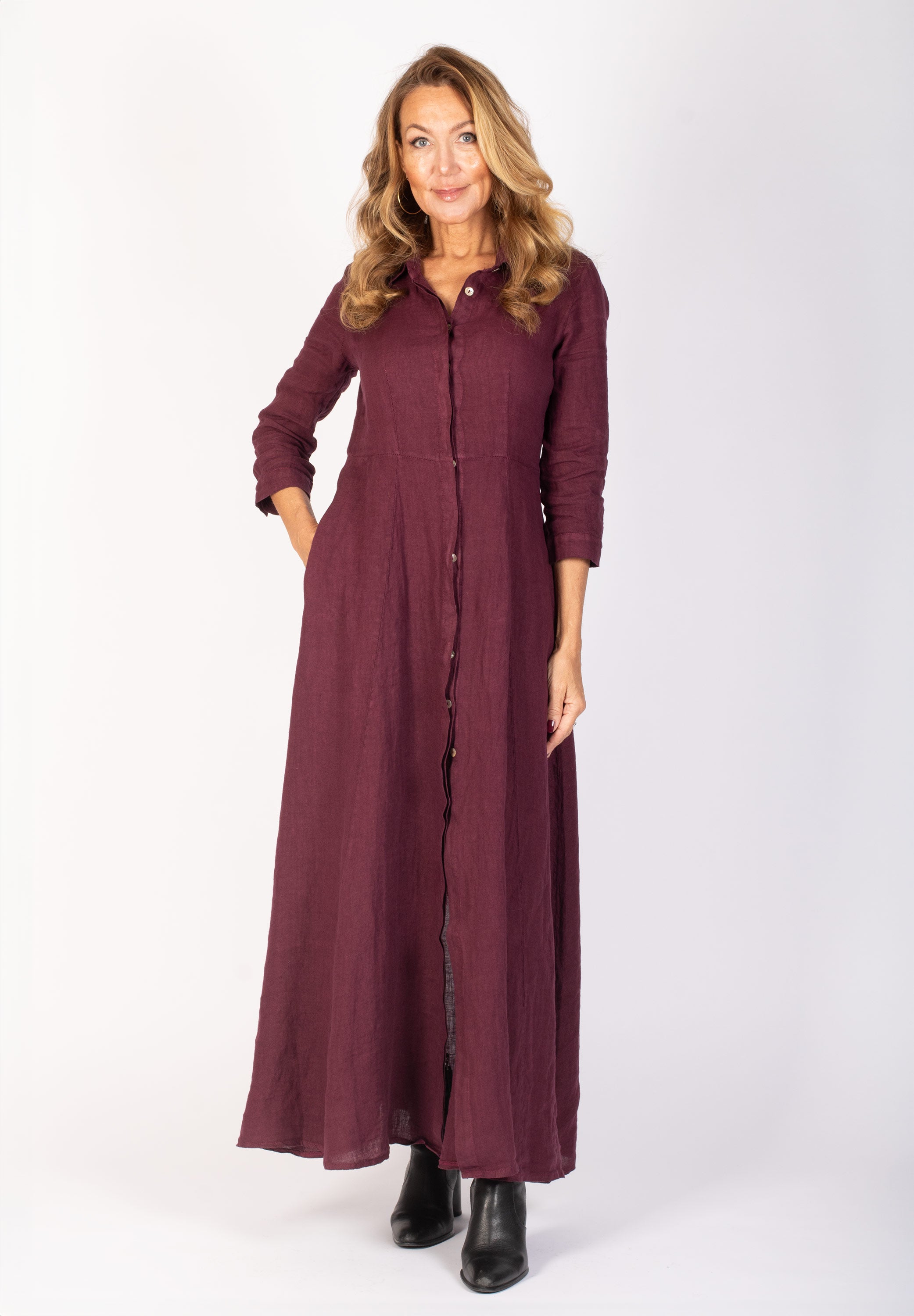 Lång skjortklänning med krage samt dold knäppning framtill. Avskuren vid midjan med utställd kjol med fickor. Trekvarts-ärm med knapp. Snygg att bära både stängd och öppen.
